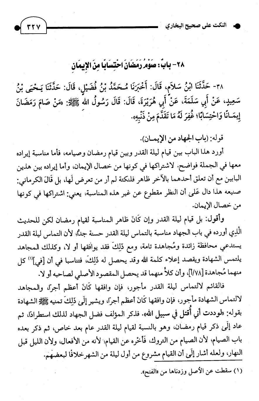 وأقول: بل قيام ليلة القدر وإن كَانَ ظاهر المناسبة لقيام رمضان لكن للحديث الذِي أورده في باب الجهاد مناسبة بالتماس ليلة القدر حسنة جدًّا؛ لأن التماس ليلة القدر يستدعي محافظة زائدة ومُجاهدة تامة، ومع ذَلِكَ فقد يوافقها أو لا، وكذلك المجاهد يلتمس الشهادة ويقصد إعلاء كلمة الله وقد يحصل له ذلكَ، فتناسبا في أن [فى] (¬1) كل منهما مُجاهدة [78 / أ] , وأن كلا منهما قد يحصل المقصود الأصلي لصاحبه أو لا.