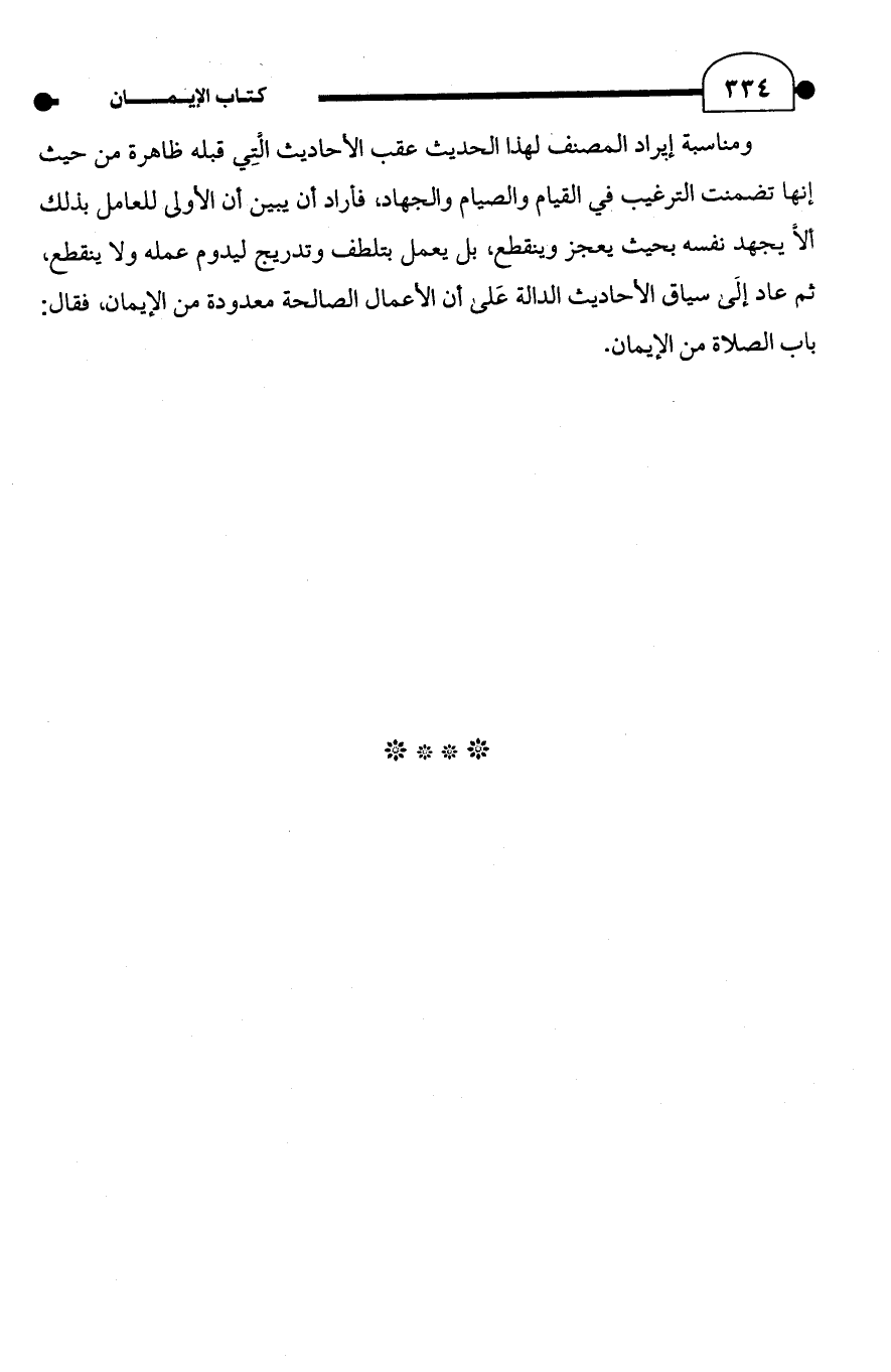 ومناسبة إيراد المصنف لهذا الحديث عقب الأحاديث التِي قبله ظاهرة من حيث إنها تضمنت الترغيب في القيام والصيام والجهاد، فأراد أن يبين أن الأولى للعامل بذلك ألا يجهد نفسه بحيث يعجز وينقطع، بل يعمل بتلطف وتدريج ليدوم عمله ولا ينقطع، ثم عاد إلَى سياق الأحاديث الدالة عَلى أن الأعمال الصالحة معدودة من الإيمان، فقال: باب الصلاة من الإيمان.