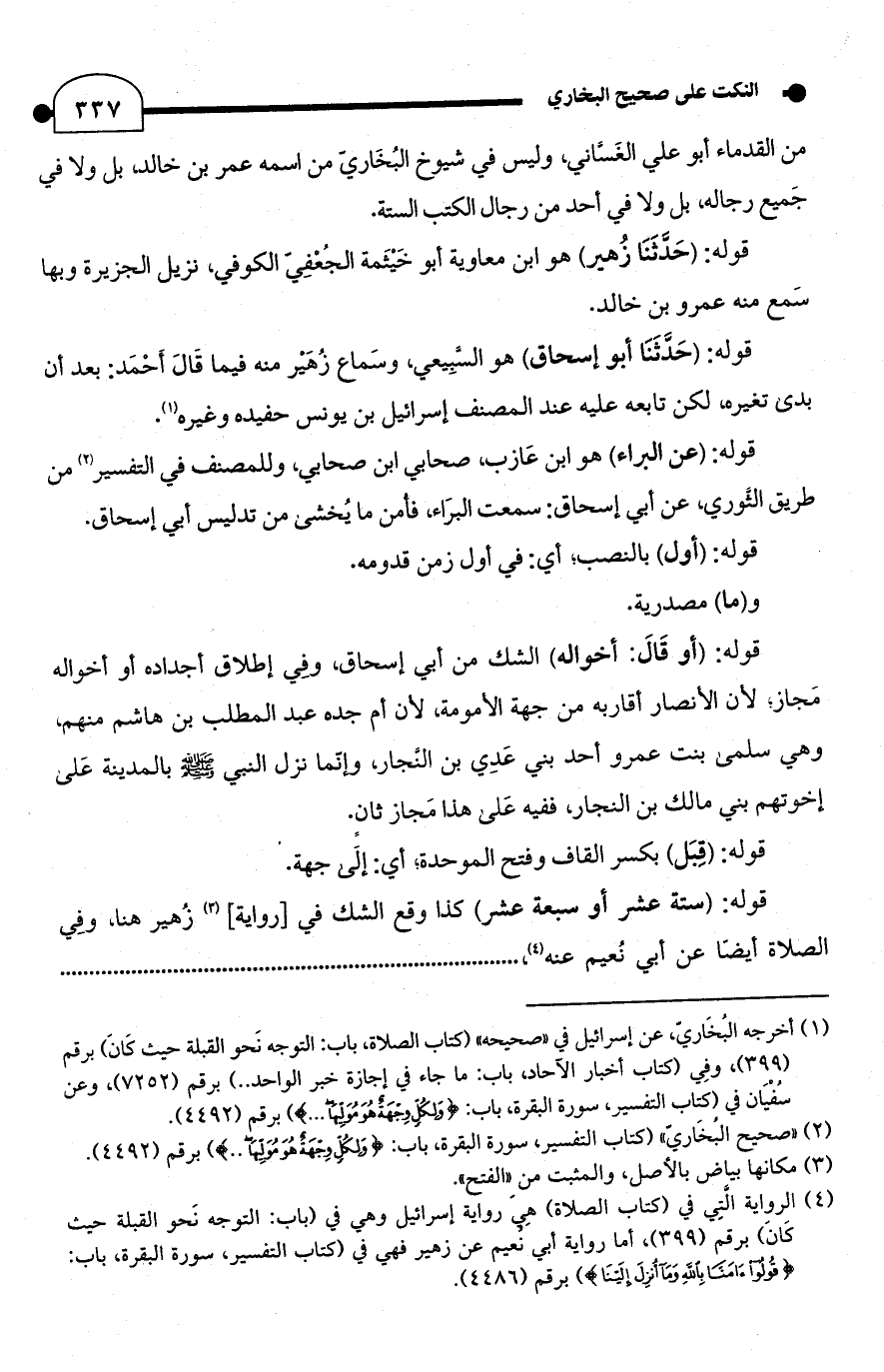 (¬4) الرواية التِي في (كتاب الصلاة) هِيَ رواية إسرائيل وهي في (باب: التوجه نَحو القبلة حيث كَان) برقم (399)، أما رواية أبي نعيم عن زهير فهي في (كتاب التفسير، سورة البقرة، باب: {قُولُوا آمَنَّا بِاللَّهِ وَمَا أُنْزِلَ إِلَيْنَا}) برقم (4486).