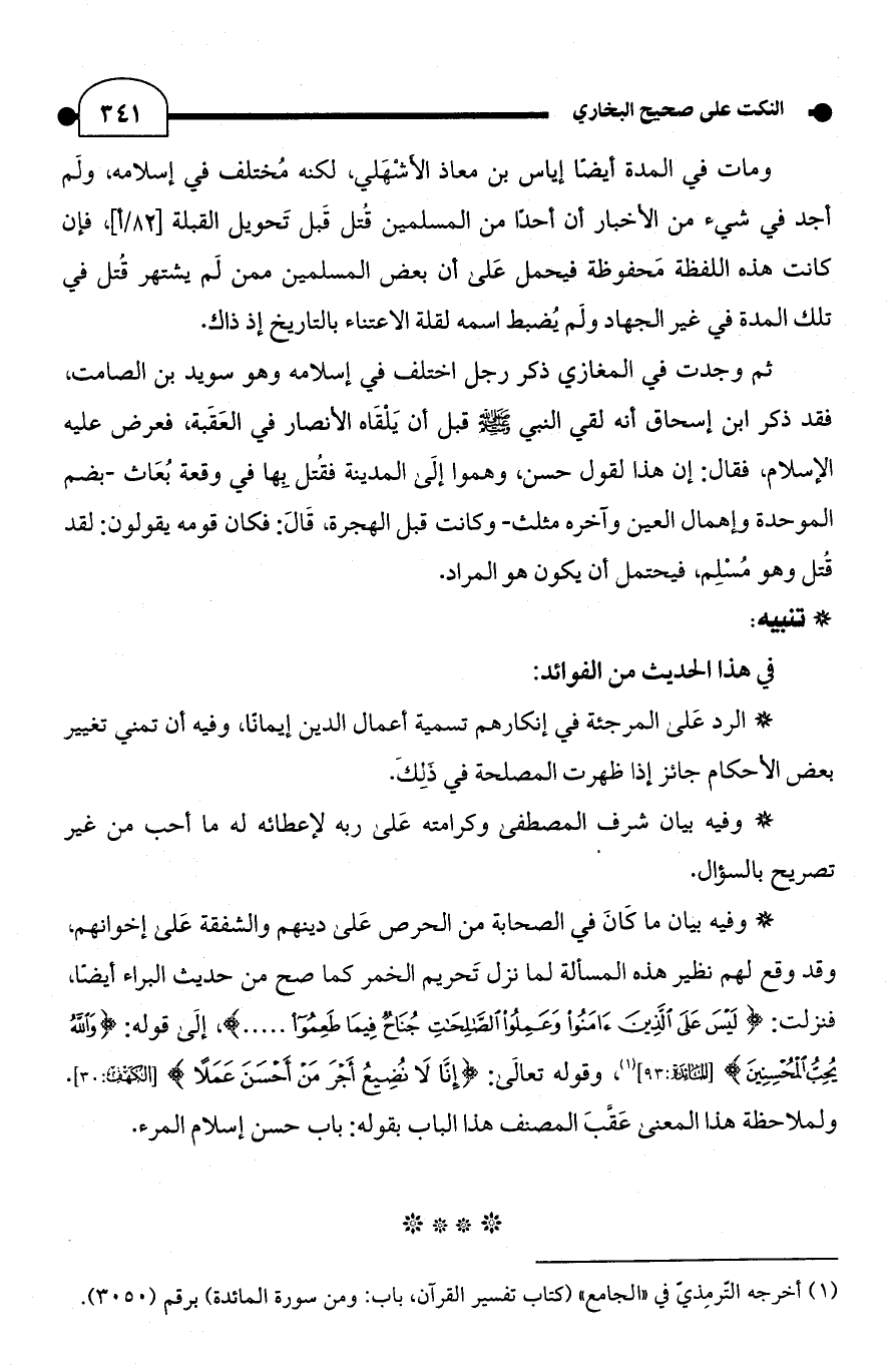 ثم وجدت في المغازي ذكر رجل اختلف في إسلامه وهو سويد بن الصامت، فقد ذكر ابن إسحاق أنه لقي النبي - صلى الله عليه وسلم - قبل أن يَلْقَاه الأنصار في العَقَبة، فعرض عليه الإسلام، فقال: إن هذا لقول حسن، وهموا إلَى المدينة فقُتل بها في وقعة بُعَاث -بضم الموحدة وإهمال العين وآخره مثلث- وكانت قبل الهجرة، قَالَ: فكان قومه يقولون: لقد قُتل وهو مُسْلِم، فيحتمل أن يكون هو المراد.