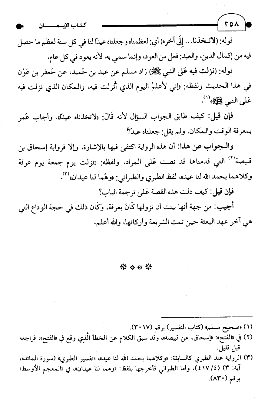 والجواب عن هذا: أن هذه الرواية اكتفى فيها بالإشارة، وإلا فرواية إسحاق بن قبيصة (¬2) التي قدمناها قد نصت عَلى المراد، ولفظه: "نزلت يوم جمعة يوم عرفة وكلاهما بحمد الله لنا عيد"، لفظ الطبري والطبراني: "وهُما لنا عيدان" (¬3).