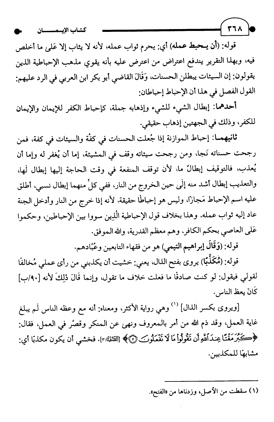 ثانيهما: إحباط الموازنة إذا جُعلت الحسنات في كفة والسيئات في كفة، فمن رجحت حسناته نَجا، ومن رجحت سيئاته وقف في المشيئة، إما أن يُغفر له وإما أن يُعذب، فالتوقيف إبطالُ ما؛ لأن توقف المنفعة في وقت الحاجة إليها إبطال لَها، والتعذيب إبطال أشد منه إلَى حين الخروج من النار، ففي كل منهما إبطال نسبي، أطلق عليه اسم الإحباط مَجازًا، وليس هو إحباطًا حقيقة؛ لأنه إذا خرج من النار وأدخل الجنة عاد إليه ثواب عمله، وهذا بخلاف قول الإحباطية الَّذِين سووا بين الإحباطين، وحكموا عَلى العاصي بحكم الكافر، وهم معظم القدرية، والله الموفق.
