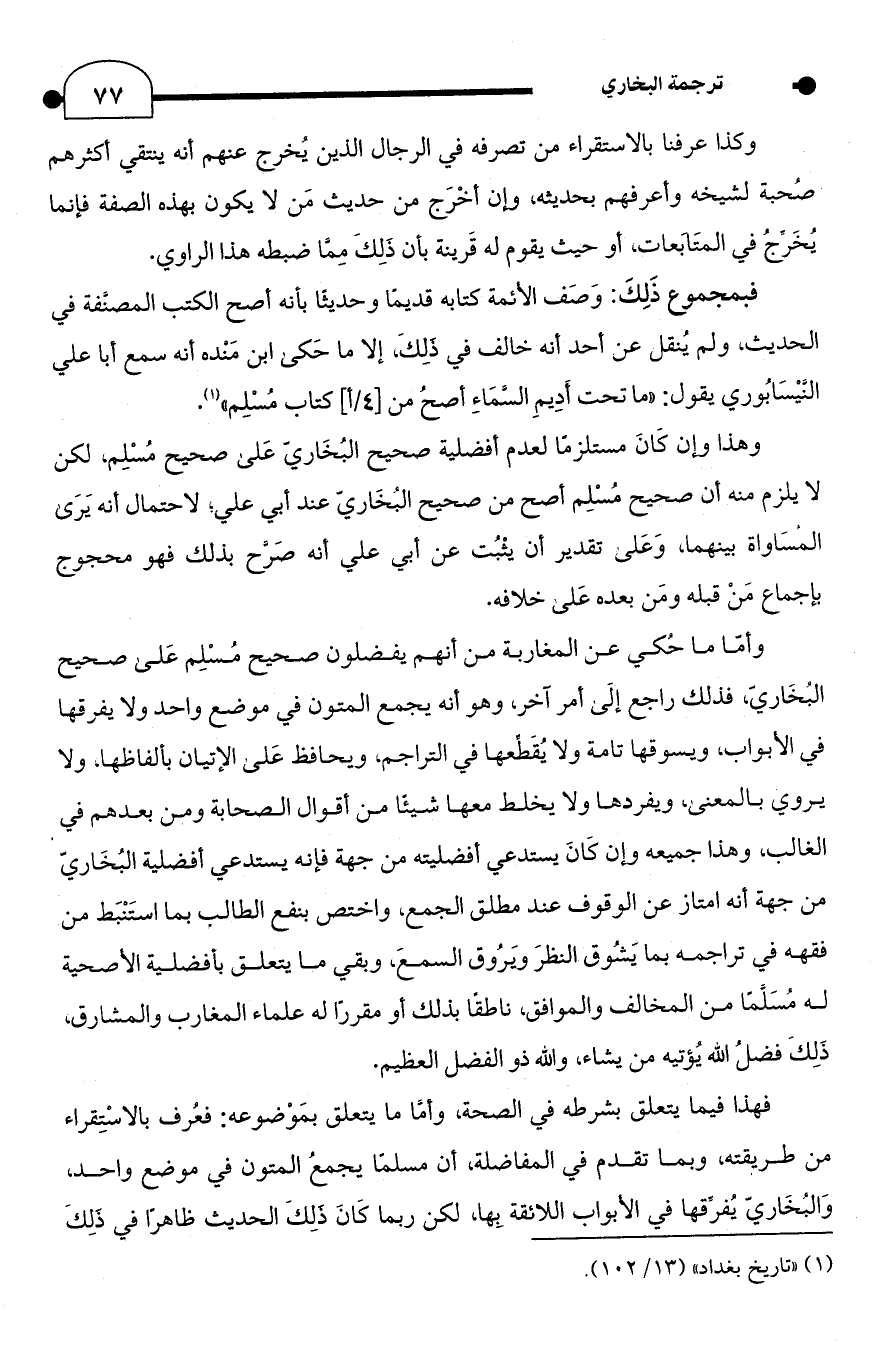 وأمّا ما حُكي عن المغاربة من أنهم يفضلون صحيح مُسْلِم عَلى صحيح البُخَاريّ، فذلك راجع إلَى أمر آخر، وهو أنه يجمع المتون في موضع واحد ولا يفرقها في الأبواب، ويسوقها تامة ولا يُقَطِّعها في التراجم، ويحافظ عَلى الإتيان بألفاظها, ولا يروي بالمعنى، ويفردها ولا يخلط معها شيئًا من أقوال الصحابة ومن بعدهم في الغالب، وهذا جميعه وإن كَانَ يستدعي أفضليته من جهة فإنه يستدعي أفضلية البُخَاريّ من جهة أنه امتاز عن الوقوف عند مطلق الجمع، واختص بنفع الطالب بما استَنْبَط من فقهه في تراجمه بما يَشُوق النظرَ ويَرُوق السمعَ، وبقي ما يتعلق بأفضلية الأصحية له مُسَلَّمًا من المخالف والموافق، ناطقًا بذلك أو مقررًا له علماء المغارب والمشارق، ذَلِكَ فضلُ الله يُؤتيه من يشاء، والله ذو الفضل العظيم.