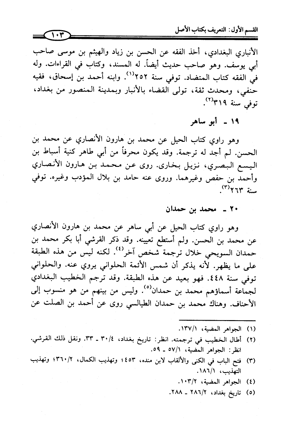 وهو راوي كتاب الحيل عن أبي ساهر عن محمد بن هارون الأنصاري عن محمد بن الحسن. ولم أستطع تعيينه. وقد ذكر القرشي أبا بكر محمد بن حمدان السويحي خلال ترجمة شخص آخر (¬4). لكنه ليس من هذه الطبقة على ما يظهر. لأنه يذكر أن شمس الأئمة الحلواني يروي عنه. والحلواني توفي سنة 448. فهو بعيد عن هذه الطبقة. وقد ترجم الخطيب البغدادي لجماعة أسماؤهم محمد بن حمدان (¬5). وليس من بينهم من هو منسوب إلى الأحناف. وهناك محمد بن حمدان الطيالسي روى عن أحمد بن الصلت عن