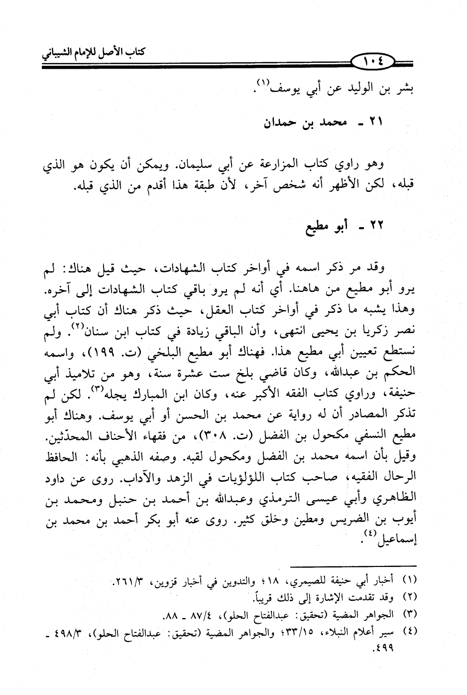 وقد مر ذكر اسمه في أواخر كتاب الشهادات، حيث قيل هناك: لم يرو أبو مطيع من هاهنا. أي أنه لم يرو باقي كتاب الشهادات إلى آخره. وهذا يشبه ما ذكر في أواخر كتاب العقل، حيث ذكر هناك أن كتاب أبي نصر زكريا بن يحيى انتهى، وأن الباقي زيادة في كتاب ابن سنان (¬2). ولم نستطع تعيين أبي مطيع هذا. فهناك أبو مطيع البلخي (ت. 199)، واسمه الحكم بن عبد الله، وكان قاضي بلخ ست عشرة سنة، وهو من تلاميذ أبي حنيفة، وراوي كتاب الفقه الأكبر عنه، وكان ابن المبارك يجله (¬3). لكن لم تذكر المصادر أن له رواية عن محمد بن الحسن أو أبي يوسف. وهناك أبو مطيع النسفي مكحول بن الفضل (ت. 308)، من فقهاء الأحناف المحدّثين. وقيل بأن اسمه محمد بن الفضل ومكحول لقبه. وصفه الذهبي بأنه: الحافظ الرحال الفقيه، صاحب كتاب اللؤلؤيات في الزهد والآداب. روى عن داود الظاهري وأبي عيسى الترمذي وعبد الله بن أحمد بن حنبل ومحمد بن أيوب بن الضريس ومطيق وخلق كثير. روى عنه أبو بكر أحمد بن محمد بن إسماعيل (¬4).