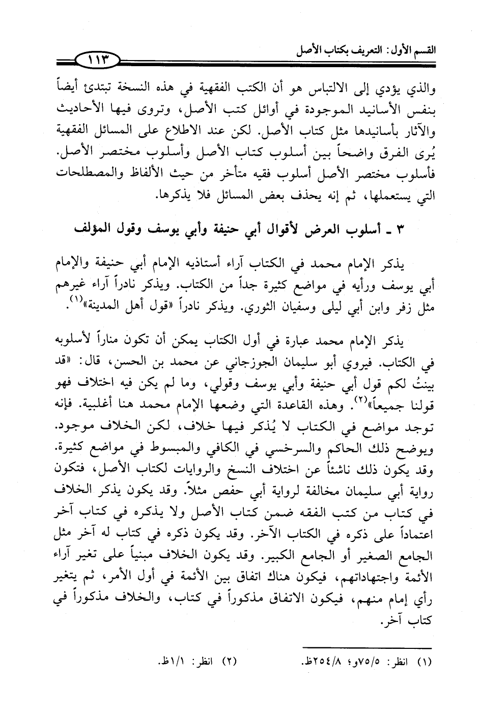 يذكر الإمام محمد عبارة في أول الكتاب يمكن أن تكون مناراً لأسلوبه في الكتاب. فيروي أبو سليمان الجوزجاني عن محمد بن الحسن، قال: "قد بينتُ لكم قول أبي حنيفة وأبي يوسف وقولي، وما لم يكن فيه اختلاف فهو قولنا جميعاً (¬2). وهذه القاعدة التي وضعها الإمام محمد هنا أغلبية. فإنه توجد مواضع في الكتاب لا يُذكر فيها خلاف، لكن الخلاف موجود. ويوضح ذلك الحاكم والسرخسي في الكافي والمبسوط في مواضع كثيرة. وقد يكون ذلك ناشئاً عن اختلاف النسخ والروايات لكتاب الأصل، فتكون رواية أبي سليمان مخالفة لرواية أبي حفص مثلاً. وقد يكون يذكر الخلاف في كتاب من كتب الفقه ضمن كتاب الأصل ولا يذكره في كتاب آخر اعتماداً على ذكره في الكتاب الآخر. وقد يكون ذكره في كتاب له آخر مثل الجامع الصغير أو الجامع الكبير. وقد يكون الخلاف مبنياً على تغير آراء الأئمة واجتهاداتهم، فيكون هناك اتفاق بين الأئمة في أول الأمر، ثم يتغير رأي إمام منهم، فيكون الاتفاق مذكوراً في كتاب، والخلاف مذكوراً في كتاب آخر.