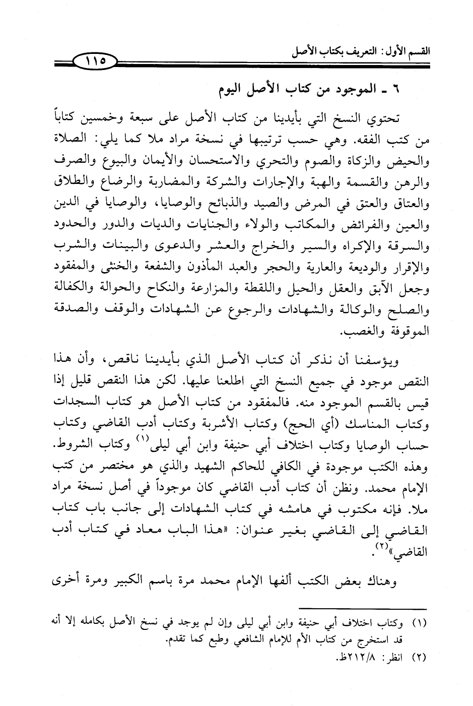 ويؤسفنا أن نذكر أن كتاب الأصل الذي بأيدينا ناقص، وأن هذا النقص موجود في جميع النسخ التي اطلعنا عليها. لكن هذا النقص قليل إذا قيس بالقسم الموجود منه. فالمفقود من كتاب الأصل هو كتاب السجدات وكتاب المناسك (أي الحج) وكتاب الأشربة وكتاب أدب القاضي وكتاب حساب الوصايا وكتاب اختلاف أبي حنيفة وابن أبي ليلى (¬1) وكتاب الشروط. وهذه الكتب موجودة في الكافي للحاكم الشهيد والذي هو مختصر من كتب الإمام محمد. ونظن أن كتاب أدب القاضي كان موجوداً في أصل نسخة مراد ملا. فإنه مكتوب في هامشه في كتاب الشهادات إلى جانب باب كتاب القاضي إلى القاضي بغير عنوان: "هذا الباب معاد في كتاب أدب القاضي" (¬2).