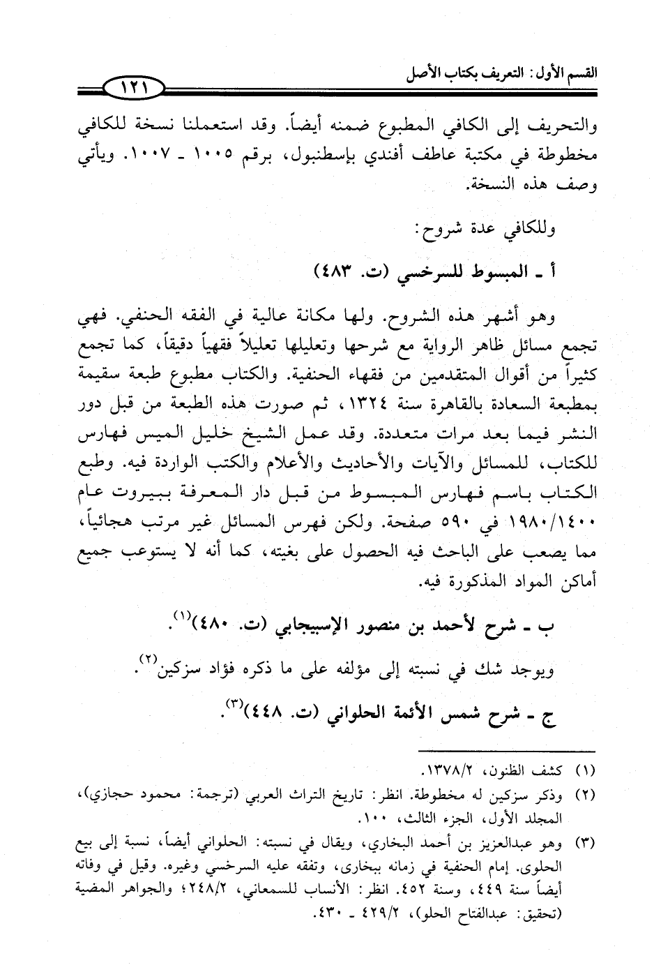 والتحريف إلى الكافي المطبوع ضمنه أيضاً. وقد استعملنا نسخة للكافي مخطوطة في مكتبة عاطف أفندي بإسطنبول، برقم 1005 - 1007. ويأتي وصف هذه النسخة.