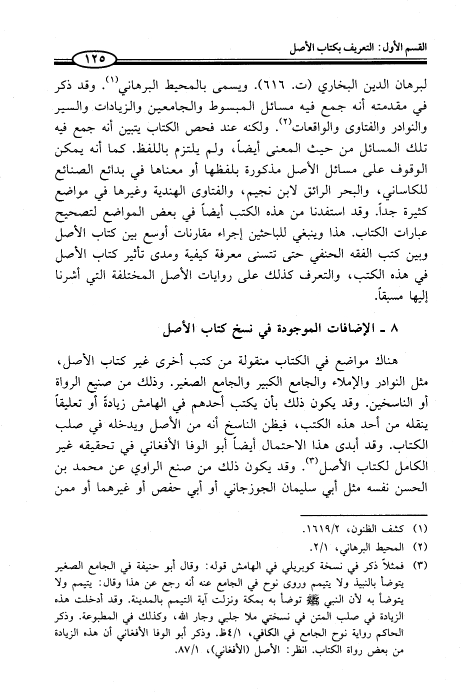 لبرهان الدين البخاري (ت. 616). ويسمى بالمحيط البرهاني (¬1). وقد ذكر في مقدمته أنه جمع فيه مسائل المبسوط والجامعين والزيادات والسير والنوادر والفتاوى والواقعات (¬2). ولكنه عند فحص الكتاب يتبين أنه جمع فيه تلك المسائل من حيث المعنى أيضاً، ولم يلتزم باللفظ. كما أنه يمكن الوقوف على مسائل الأصل مذكورة بلفظها أو معناها في بدائع الصنائع للكاساني، والبحر الرائق لابن نجيم، والفتاوى الهندية وغيرها في مواضع كثيرة جداً. وقد استفدنا من هذه الكتب أيضاً في بعض المواضع لتصحيح عبارات الكتاب. هذا وينبغي للباحثين إجراء مقارنات أوسع بين كتاب الأصل وبين كتب الفقه الحنفي حتى تتسنى معرفة كيفية ومدى تأثير كتاب الأصل في هذه الكتب، والتعرف كذلك على روايات الأصل المختلفة التي أشرنا إليها مسبقاً.