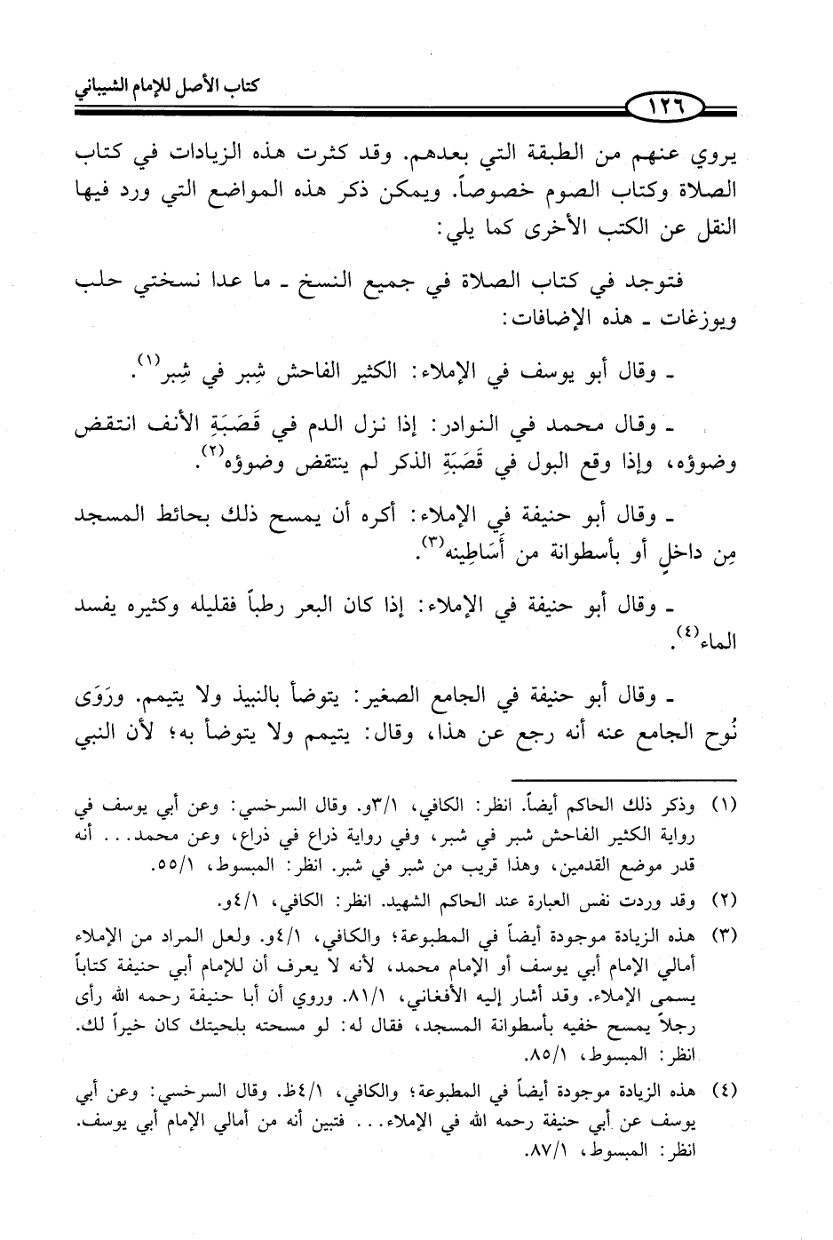(¬4) هذه الزيادة موجودة أيضاً في المطبوعة؛ والكافي، 1/ 4 ظ. وقال السرخسي: وعن أبي يوسف عن أبي حنيفة -رحمه الله- في الإملاء ... فتبين أنه من أمالي الإمام أبي يوسف. انظر: المبسوط، 1/ 87.