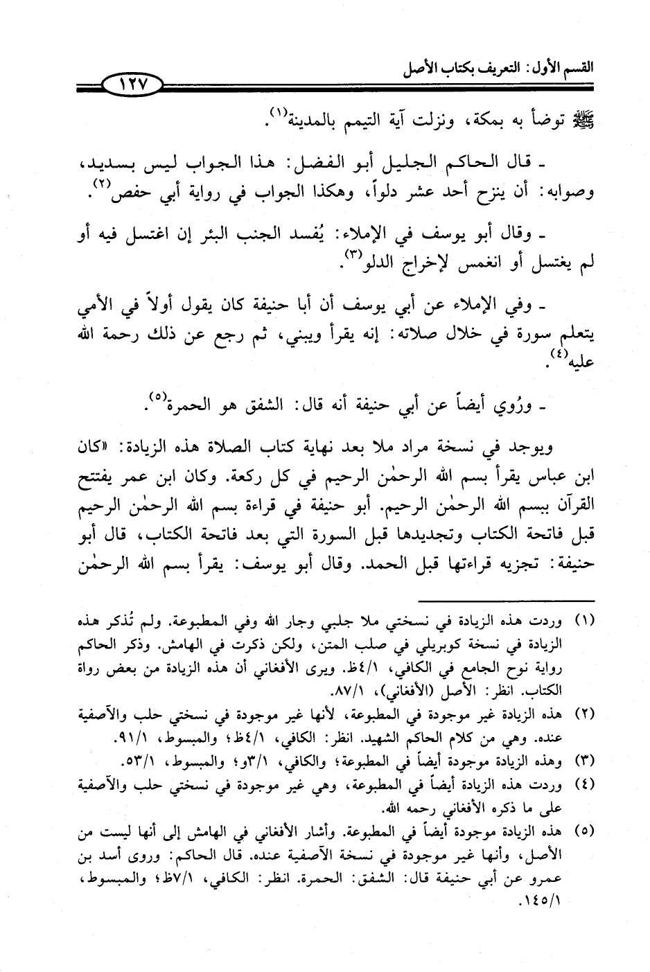 (¬1) وردت هذه الزيادة في نسختي ملا جلبي وجار الله وفي المطبوعة. ولم تُذكر هذه الزيادة في نسخة كوبريلي في صلب المتن، ولكن ذكرت في الهامش. وذكر الحاكم رواية نوح الجامع في الكافي، 1/ 4 ظ. ويرى الأفغاني أن هذه الزيادة من بعض رواة الكتاب. انظر: الأصل (الأفغاني)، 1/ 87 ـ