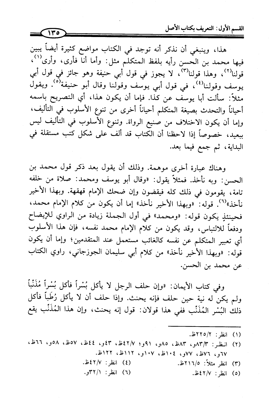 هذا، وينبغي أن نذكر أنه توجد في الكتاب مواضع كثيرة أيضاً يبين فيها محمد بن الحسن رأيه بلفظ المتكلم مثل: وأما أنا فأرى، وأرى (¬1)، قولنا (¬2)، وهذا قولنا (¬3)، لا يجوز في قول أبي حنيفة وهو جائز في قول أبي يوسف وقولنا (¬4)، في قول أبي يوسف وقولنا وقال أبو حنيفة (¬5). ويقول مثلاً: سألت أبا يوسف عن كذا. فإما أن يكون هذا، أي التصريح باسمه أحياناً والتحدث بصيغة المتكلم أحياناً أخرى من تنوع الأسلوب في التأليف، وإما أن يكون الاختلاف من صنيع الرواة. وتنوع الأسلوب في التأليف ليس ببعيد، خصوصاً إذا لاحظنا أن الكتاب قد ألف على شكل كتب مستقلة في البداية، ثم جمع فيما بعد.