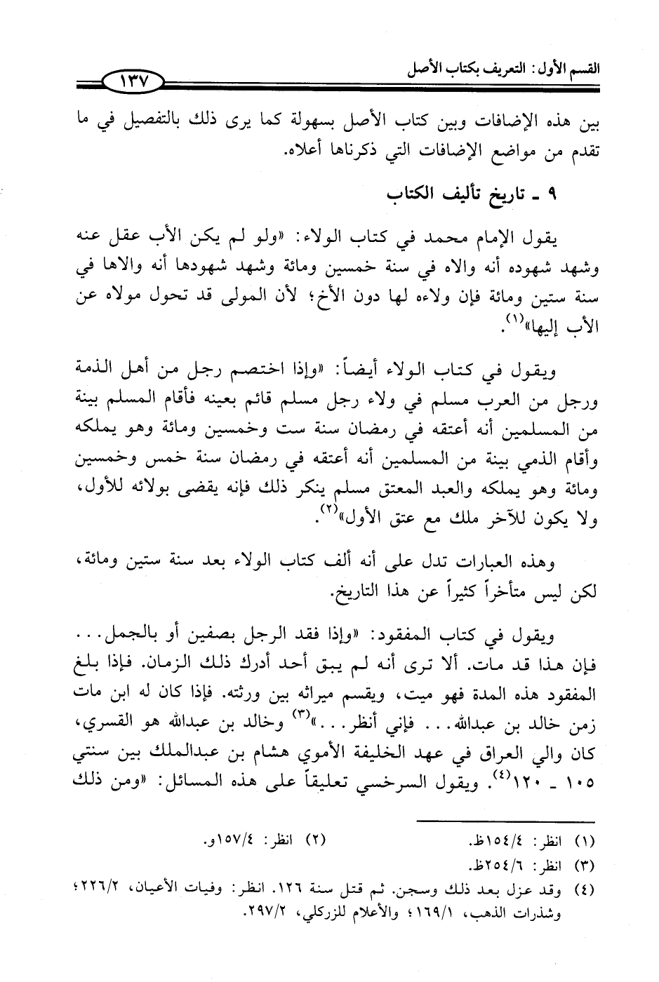 ويقول في كتاب المفقود: "واذا فقد الرجل بصفين أو بالجمل ... فإن هذا قد مات. ألا ترى أنه لم يبق أحد أدرك ذلك الزمان. فإذا بلغ المفقود هذه المدة فهو ميت، ويقسم ميراثه بين ورثته. فإذا كان له ابن مات زمن خالد بن عبد الله ... فإني أنظر ... " (¬3) وخالد بن عبد الله هو القسري، كان والي العراق في عهد الخليفة الأموي هشام بن عبدالملك بين سنتي 105 - 120 (¬4). ويقول السرخسي تعليقاً على هذه المسائل: "ومن ذلك