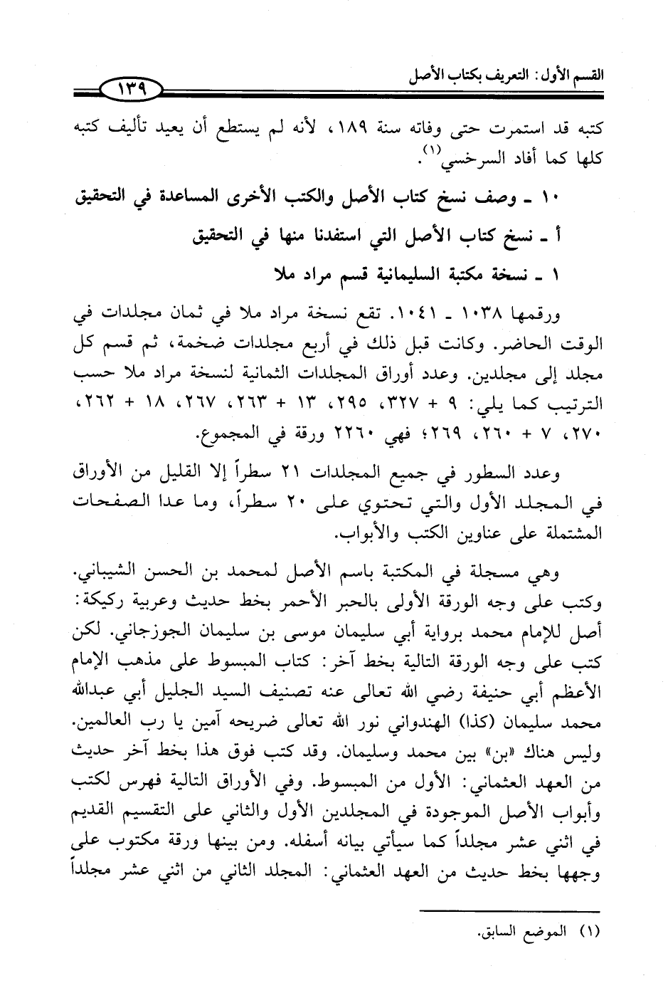 10 - وصف نسخ كتاب الأصل والكتب الأخرى المساعدة في التحقيق
