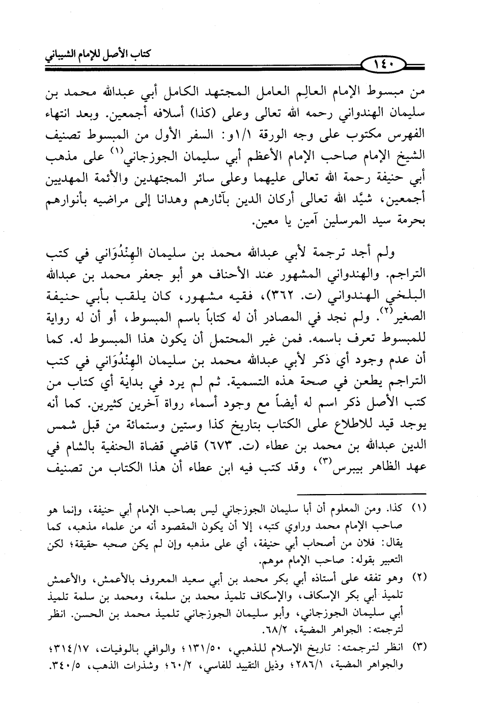 ولم أجد ترجمة لأبي عبد الله محمد بن سليمان الهِنْدُوَاني في كتب التراجم. والهندواني المشهور عند الأحناف هو أبو جعفر محمد بن عبد الله البلخي الهندواني (ت. 362)، فقيه مشهور، كان يلقب بأبي حنيفة الصغير (¬2). ولم نجد في المصادر أن له كتاباً باسم المبسوط، أو أن له رواية للمبسوط تعرف باسمه. فمن غير المحتمل أن يكون هذا المبسوط له. كما أن عدم وجود أي ذكر لأبي عبد الله محمد بن سليمان الهِنْدُوَاني في كتب التراجم يطعن في صحة هذه التسمية. ثم لم يرد في بداية أي كتاب من كتب الأصل ذكر اسم له أيضاً مع وجود أسماء رواة آخرين كثيرين. كما أنه يوجد قيد للاطلاع على الكتاب بتاريخ كذا وستين وستمائة من قبل شمس الدين عبد الله بن محمد بن عطاء (ت. 673) قاضي قضاة الحنفية بالشام في عهد الظاهر بيبرس (¬3)، وقد كتب فيه ابن عطاء أن هذا الكتاب من تصنيف