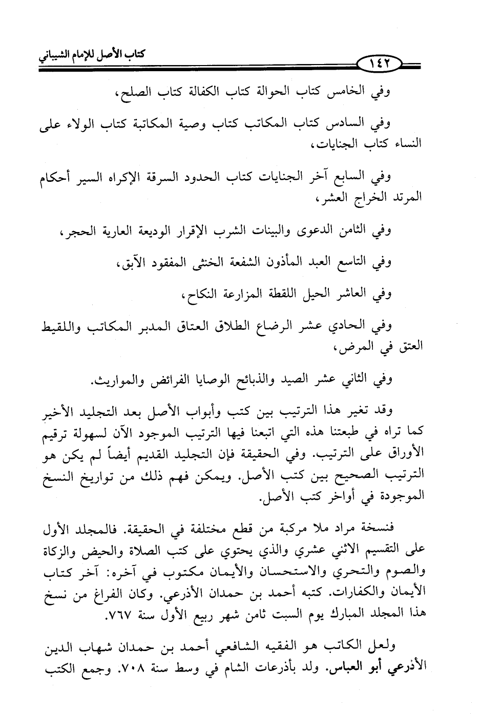 وقد تغير هذا الترتيب بين كتب وأبواب الأصل بعد التجليد الأخير كما تراه في طبعتنا هذه التي اتبعنا فيها الترتيب الموجود الآن لسهولة ترقيم الأوراق على الترتيب. وفي الحقيقة فإن التجليد القديم أيضاً لم يكن هو الترتيب الصحيح بين كتب الأصل. ويمكن فهم ذلك من تواريخ النسخ الموجودة في أواخر كتب الأصل.