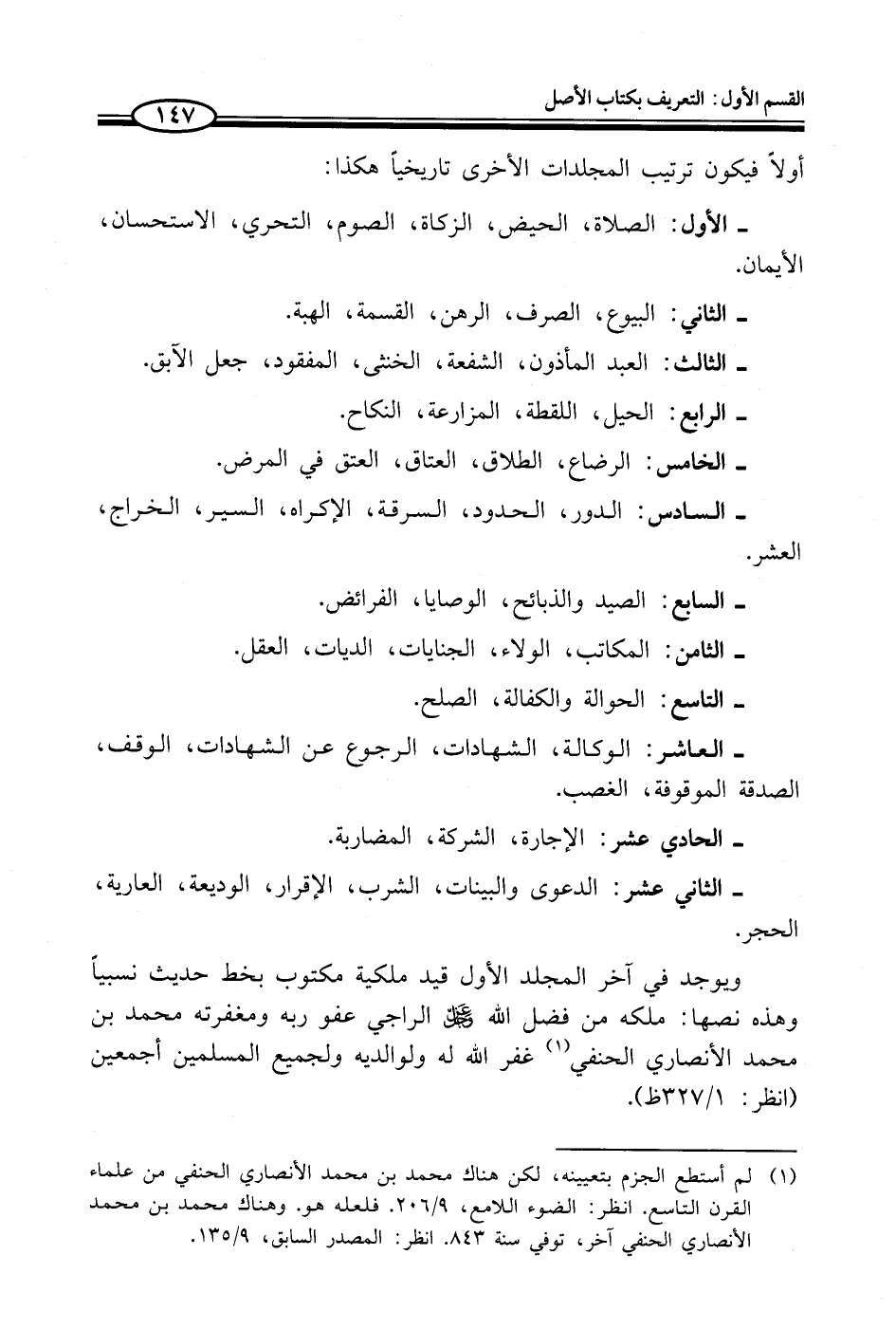 ويوجد في آخر المجلد الأول قيد ملكية مكتوب بخط حديث نسبياً وهذه نصها: ملكه من فضل الله -عَزَّ وَجَلَّ- الراجي عفو ربه ومغفرته محمد بن محمد الأنصاري الحنفي (¬1) غفر الله له ولوالديه ولجميع المسلمين أجمعين (انظر: 1/ 327 ظ).