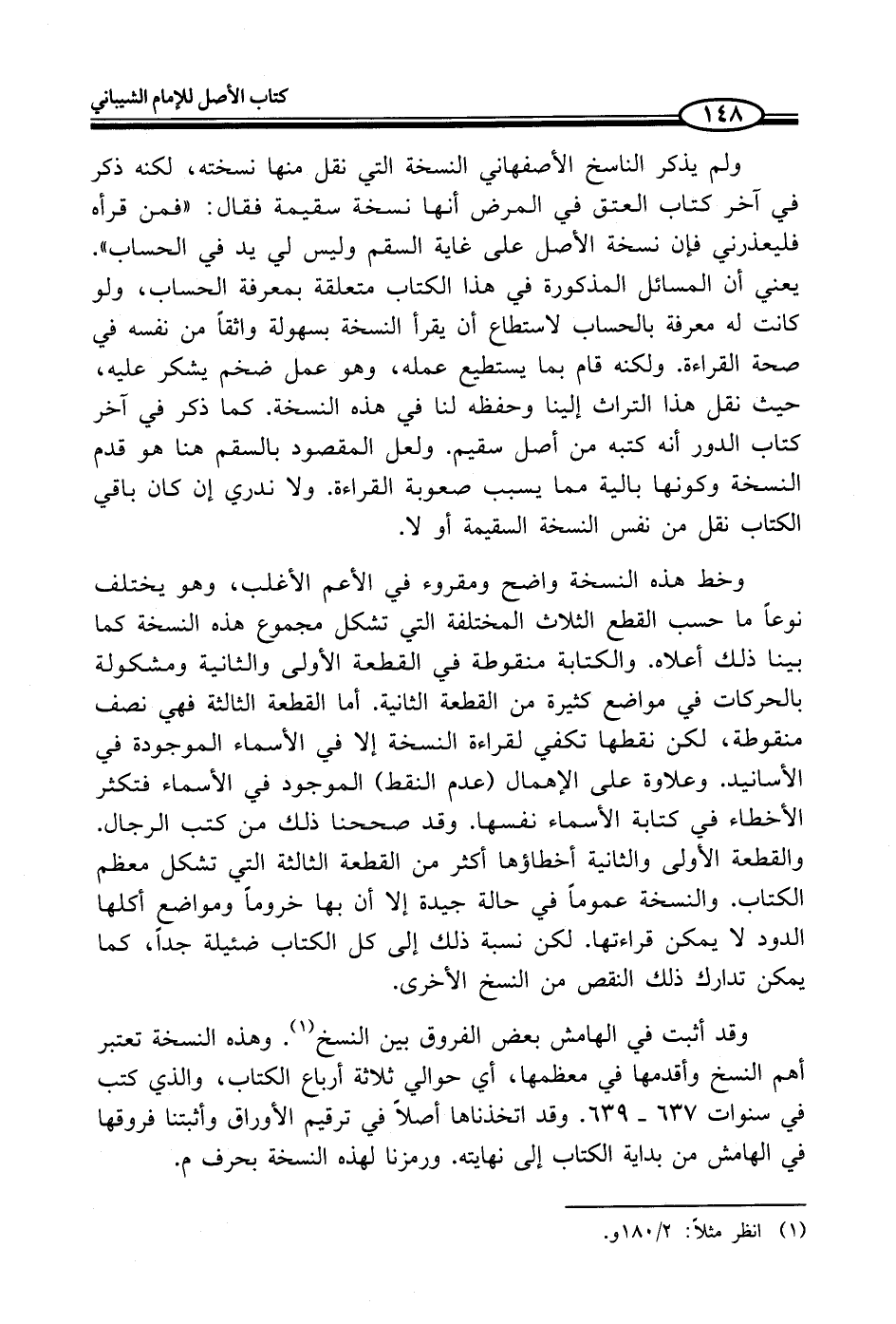 وقد أثبت في الهامش بعض الفروق بين النسخ (¬1). وهذه النسخة تعتبر أهم النسخ وأقدمها في معظمها، أي حوالي ثلاثة أرباع الكتاب، والذي كتب في سنوات 637 - 639. وقد اتخذناها أصلاً في ترقيم الأوراق وأثبتنا فروقها في الهامش من بداية الكتاب إلى نهايته. ورمزنا لهذه النسخة بحرف م.