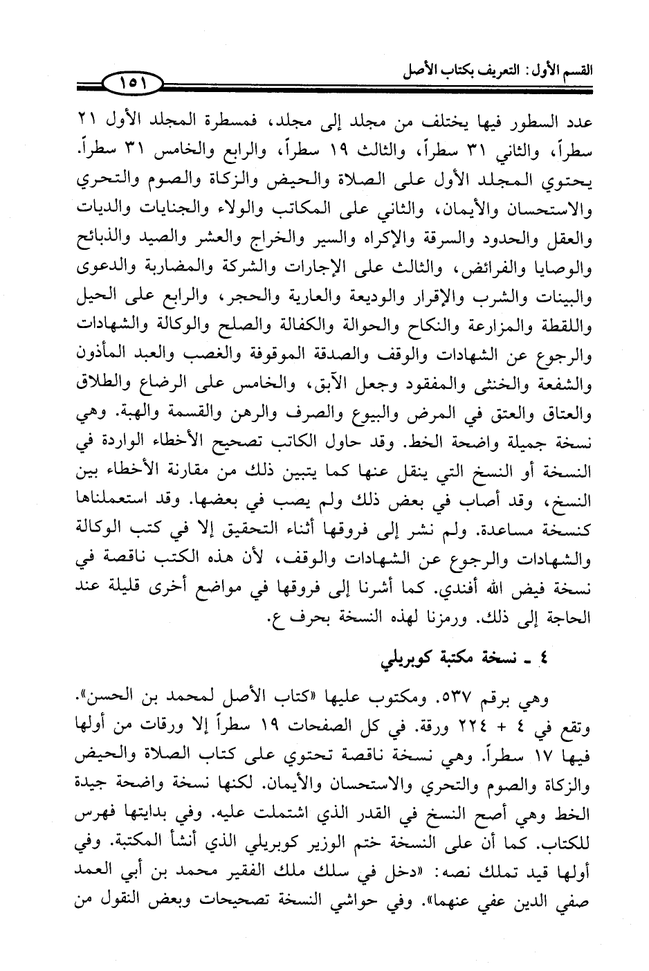 عدد السطور فيها يختلف من مجلد إلى مجلد، فمسطرة المجلد الأول 21 سطرًا، والثاني 31 سطراً، والثالث 19 سطراً، والرابع والخامس 31 سطرًا. يحتوي المجلد الأول على الصلاة والحيض والزكاة والصوم والتحري والاستحسان والأيمان، والثاني على المكاتب والولاء والجنايات والديات والعقل والحدود والسرقة والإكراه والسير والخراج والعشر والصيد والذبائح والوصايا والفرائض، والثالث على الإجارات والشركة والمضاربة والدعوى والبينات والشرب والإقرار والوديعة والعارية والحجر، والرابع على الحيل واللقطة والمزارعة والنكاح والحوالة والكفالة والصلح والوكالة والشهادات والرجوع عن الشهادات والوقف والصدقة الموقوفة والغصب والعبد المأذون والشفعة والخنثى والمفقود وجعل الآبق، والخامس على الرضاع والطلاق والعتاق والعتق في المرض والبيوع والصرف والرهن والقسمة والهبة. وهي نسخة جميلة واضحة الخط. وقد حاول الكاتب تصحيح الأخطاء الواردة في النسخة أو النسخ التي ينقل عنها كما يتبين ذلك من مقارنة الأخطاء بين النسخ، وقد أصاب في بعض ذلك ولم يصب في بعضها. وقد استعملناها كنسخة مساعدة. ولم نشر إلى فروقها أثناء التحقيق إلا في كتب الوكالة والشهادات والرجوع عن الشهادات والوقف، لأن هذه الكتب ناقصة في نسخة فيض الله أفندي. كما أشرنا إلى فروقها في مواضع أخرى قليلة عند الحاجة إلى ذلك. ورمزنا لهذه النسخة بحرف ع.