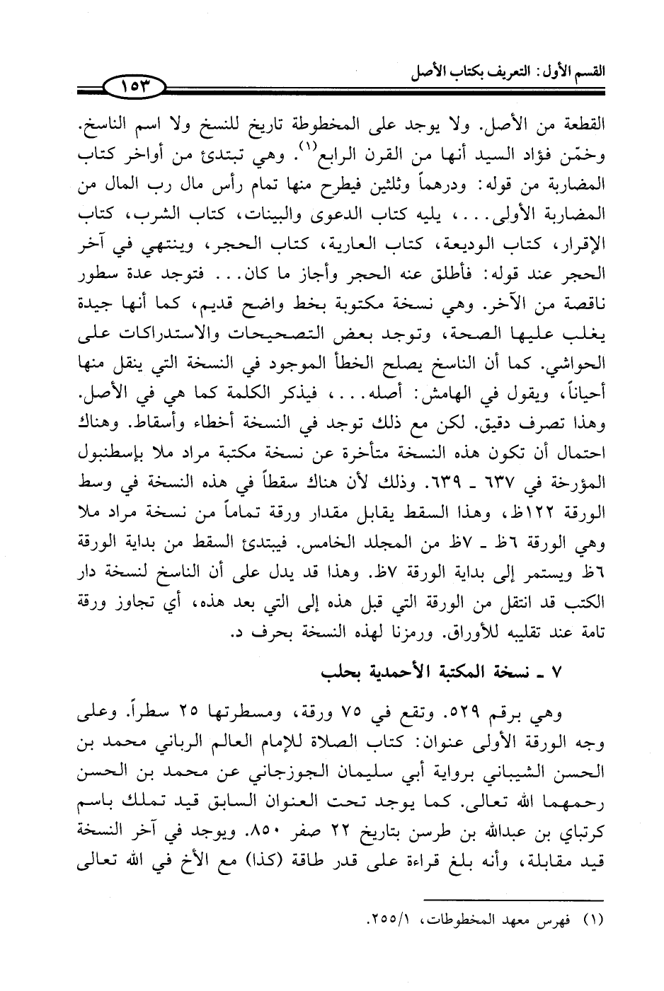 القطعة من الأصل. ولا يوجد على المخطوطة تاريخ للنسخ ولا اسم الناسخ. وخمّن فؤاد السيد أنها من القرن الرابع (¬1). وهي تبتدئ من أواخر كتاب المضاربة من قوله: ودرهماً وثلثين فيطرح منها تمام رأس مال رب المال من المضاربة الأولى ... ، يليه كتاب الدعوى والبينات، كتاب الشرب، كتاب الإقرار، كتاب الوديعة، كتاب العارية، كتاب الحجر، وينتهي في آخر الحجر عند قوله: فأطلق عنه الحجر وأجاز ما كان ... فتوجد عدة سطور ناقصة من الآخر. وهي نسخة مكتوبة بخط واضح قديم، كما أنها جيدة يغلب عليها الصحة، وتوجد بعض التصحيحات والاستدراكات على الحواشي. كما أن الناسخ يصلح الخطأ الموجود في النسخة التي ينقل منها أحياناً، ويقول في الهامش: أصله ... ، فيذكر الكلمة كما هي في الأصل. وهذا تصرف دقيق. لكن مع ذلك توجد في النسخة أخطاء وأسقاط. وهناك احتمال أن تكون هذه النسخة متأخرة عن نسخة مكتبة مراد ملا بإسطنبول المؤرخة في 637 - 639. وذلك لأن هناك سقطاً في هذه النسخة في وسط الورقة 122 ظ، وهذا السقط يقابل مقدار ورقة تمامًا من نسخة مراد ملا وهي الورقة 6 ظ- 7 ظ من المجلد الخامس. فيبتدئ السقط من بداية الورقة 6 ظ ويستمر إلى بداية الورقة 7 ظ. وهذا قد يدل على أن الناسخ لنسخة دار الكتب قد انتقل من الورقة التي قبل هذه إلى التي بعد هذه، أي تجاوز ورقة تامة عند تقليبه للأوراق. ورمزنا لهذه النسخة بحرف د.