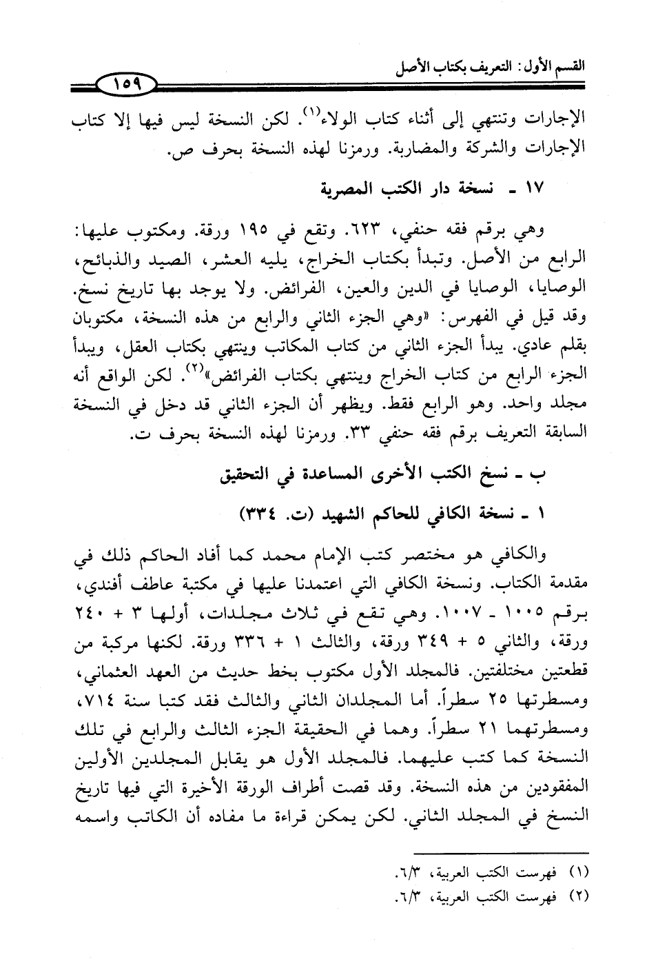 والكافي هو مختصر كتب الإمام محمد كما أفاد الحاكم ذلك في مقدمة الكتاب. ونسخة الكافي التي اعتمدنا عليها في مكتبة عاطف أفندي، برقم 1005 - 1007. وهي تقع في ثلاث مجلدات، أولها 3+ 240 ورقة، والثاني 5+ 349 ورقة، والثالث 1+ 336 ورقة. لكنها مركبة من قطعتين مختلفتين. فالمجلد الأول مكتوب بخط حديث من العهد العثماني، ومسطرتها 25 سطراً. أما المجلدان الثاني والثالث فقد كتبا سنة 714، ومسطرتهما 21 سطراً. وهما في الحقيقة الجزء الثالث والرابع في تلك النسخة كما كتب عليهما. فالمجلد الأول هو يقابل المجلدين الأولين المفقودين من هذه النسخة. وقد قصت أطراف الورقة الأخيرة التي فيها تاريخ النسخ في المجلد الثاني. لكن يمكن قراءة ما مفاده أن الكاتب واسمه