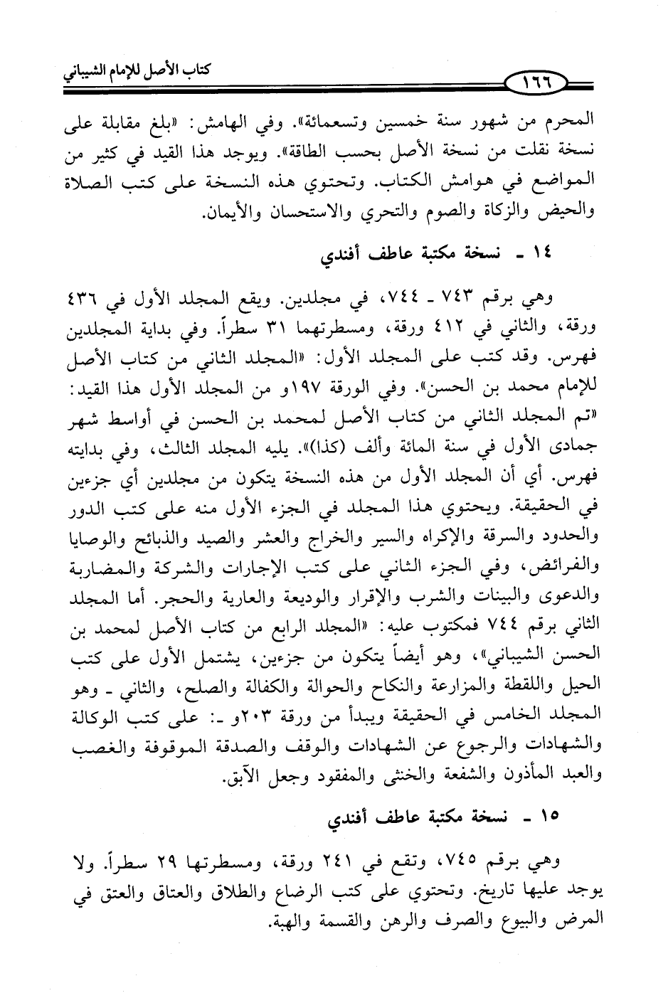 وهي برقم 743 - 744، في مجلدين. ويقع المجلد الأول في 436 ورقة، والثاني في 412 ورقة، ومسطرتهما 31 مسطراً. وفي بداية المجلدين فهرس. وقد كتب على المجلد الأول: "المجلد الثاني من كتاب الأصل للإمام محمد بن الحسن". وفي الورقة 197 ومن المجلد الأول هذا القيد: "تم المجلد الثاني من كتاب الأصل لمحمد بن الحسن في أواسط شهر جمادى الأول في سنة المائة وألف (كذا) ". يليه المجلد الثالث، وفي بدايته فهرس. أي أن المجلد الأول من هذه النسخة يتكون من مجلدين أي جزءين في الحقيقة. ويحتوي هذا المجلد في الجزء الأول منه على كتب الدور والحدود والسرقة والإكراه والسير والخراج والعشر والصيد والذبائح والوصايا والفرائض، وفي الجزء الثاني على كتب الإجارات والشركة والمضاربة والدعوى والبينات والشرب والإقرار والوديعة والعارية والحجر. أما المجلد الثاني برقم 744 فمكتوب عليه: "المجلد الرابع من كتاب الأصل لمحمد بن الحسن الشيباني"، وهو أيضاً يتكون من جزءين، يشتمل الأول على كتب الحيل واللقطة والمزارعة والنكاح والحوالة والكفالة والصلح، والثاني - وهو المجلد الخامس في الحقيقة ويبدأ من ورقة 203 و -: على كتب الوكالة والشهادات والرجوع عن الشهادات والوقف والصدقة الموقوفة والغصب والعبد المأذون والشفعة والخنثى والمفقود وجعل الآبق.