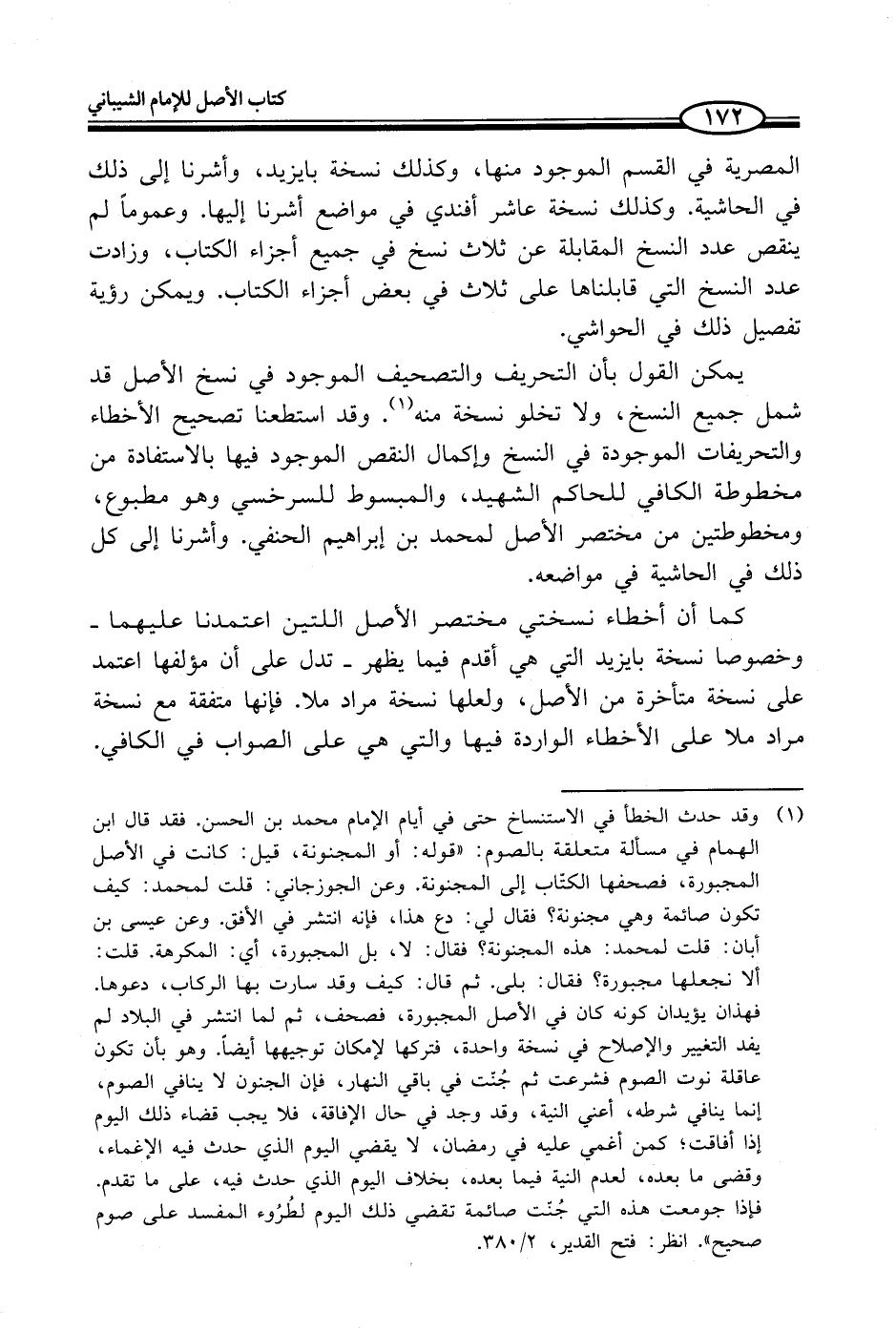 (¬1) وقد حدث الخطأ في الاستنساخ حتى في أيام الإمام محمد بن الحسن. فقد قال ابن الهمام في مسألة متعلقة بالصوم: "قوله: أو المجنونة، قيل: كانت في الأصل المجبورة، فصحفها الكتّاب إلى المجنونة. وعن الجوزجاني: قلت لمحمد: كيف تكون صائمة وهي مجنونة؟ فقال في: دع هذا، فإنه انتشر في الأفق. وعن عيسى بن أبان: قلت لمحمد: هذه المجنونة؟ فقال: لا، بل المجبورة، أي: المكرهة. قلت: ألا نجعلها مجبورة؟ فقال: بلى. ثم قال: كيف وقد سارت بها الركاب، دعوها. فهذان يؤيدان كونه كان في الأصل المجبورة، فصحف، ثم لما انتشر في البلاد لم يفد التغيير والإصلاح في نسخة واحدة، فتركها لإمكان توجيهها أيضاً. وهو بأن تكون عاقلة نوت الصوم فشرعت ثم جُنّت في باقي النهار، فإن الجنون لا ينافي الصوم، إنما ينافي شرطه، أعني النية، وقد وجد في حال الإفاقة، فلا يجب قضاء ذلك اليوم إذا أفاقت؛ كمن أغمي عليه في رمضان، لا يقضي اليوم الذي حدث فيه الإغماء، وقضى ما بعده، لعدم النية فيما بعده، بخلاف اليوم الذي حدث فيه، على ما تقدم. فإذا جومعت هذه التي جُنّت صائمة تقضي ذلك اليوم لطُرُوء المفسد على صوم صحيح ". انظر: فتح القدير، 2/ 380.