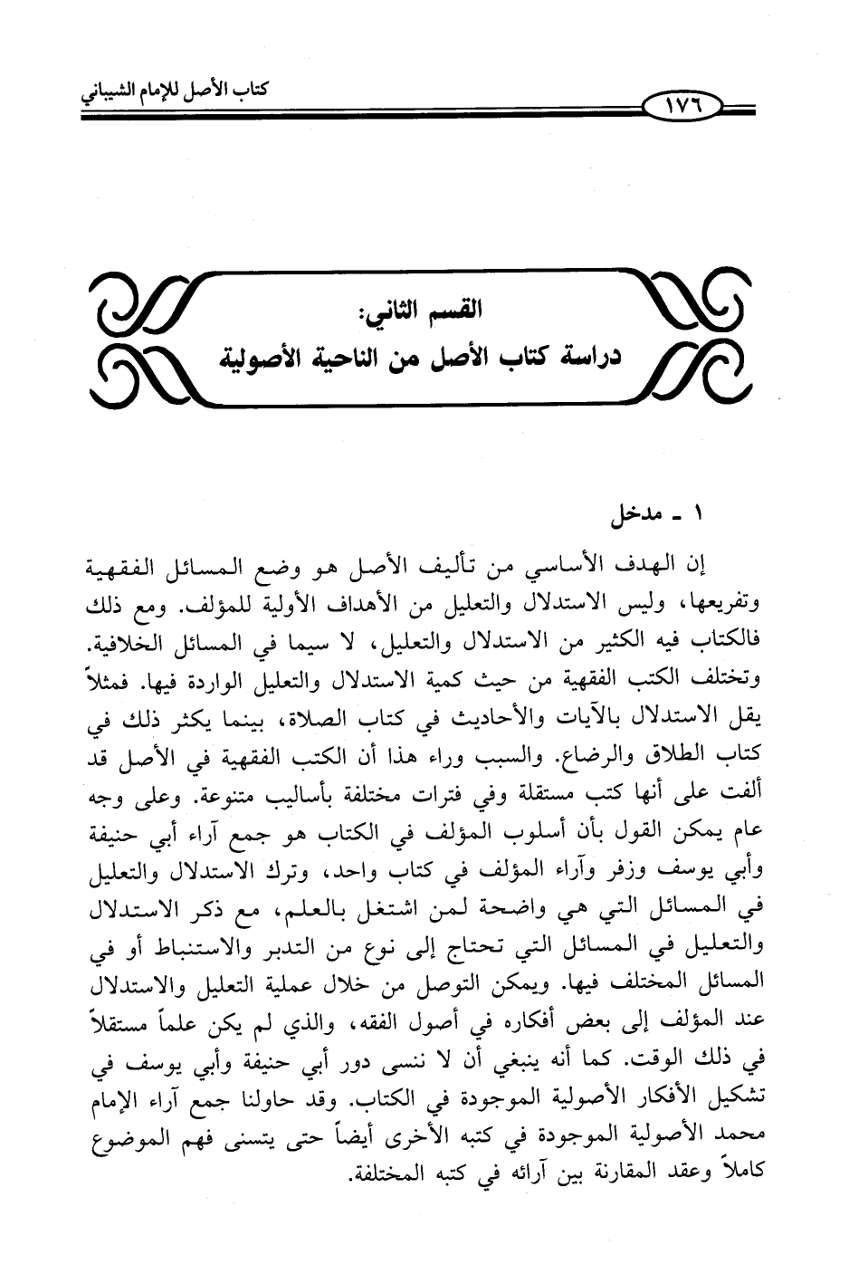 إن الهدف الأساسي من تأليف الأصل هو وضع المسائل الفقهية وتفريعها، وليس الاستدلال والتعليل من الأهداف الأولية للمؤلف. ومع ذلك فالكتاب فيه الكثير من الاستدلال والتعليل، لا سيما في المسائل الخلافية. وتختلف الكتب الفقهية من حيث كمية الاستدلال والتعليل الواردة فيها. فمثلاً يقل الاستدلال بالآيات والأحاديث في كتاب الصلاة، بينما يكثر ذلك في كتاب الطلاق والرضاع. والسبب وراء هذا أن الكتب الفقهية في الأصل قد ألفت على أنها كتب مستقلة وفي فترات مختلفة بأساليب متنوعة. وعلى وجه عام يمكن القول بأن أسلوب المؤلف في الكتاب هو جمع آراء أبي حنيفة وأبي يوسف وزفر وآراء المؤلف في كتاب واحد، وترك الاستدلال والتعليل في المسائل التي هي واضحة لمن اشتغل بالعلم، مع ذكر الاستدلال والتعليل في المسائل التي تحتاج إلى نوع من التدبر والاستنباط أو في المسائل المختلف فيها. ويمكن التوصل من خلال عملية التعليل والاستدلال عند المؤلف إلى بعض أفكاره في أصول الفقه، والذي لم يكن علماً مستقلاً في ذلك الوقت. كما أنه ينبغي أن لا ننسى دور أبي حنيفة وأبي يوسف في تشكيل الأفكار الأصولية الموجودة في الكتاب. وقد حاولنا جمع آراء الإمام محمد الأصولية الموجودة في كتبه الأخرى أيضاً حتى يتسنى فهم الموضوع كاملاً وعقد المقارنة بين آرائه في كتبه المختلفة.