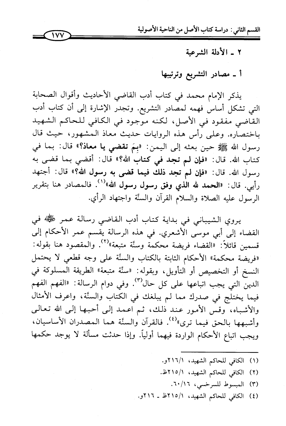 يروي الشيباني في بداية كتاب أدب القاضي رسالة عمر - رضي الله عنه - في القضاء إلى أبي موسى الأشعري. في هذه الرسالة يقسم عمر الأحكام إلى قسمين قائلًا: "القضاء فريضة محكمة وسنَّة متبعة" (¬2). والمقصود هنا بقوله: "فريضة محكمة" الأحكام الثابتة بالكتاب والسنَّة على وجه قطعي لا يحتمل النسخ أو التخصيص أو التأويل، وبقوله: "سنَّة متبعة" الطريقة المسلوكة في الدين التي يجب اتباعها على كل حال (¬3). وفي دوام الرسالة: "الفهم الفهم فيما يختلج في صدرك مما لم يبلغك في الكتاب والسنَّة، واعرف الأمثال والأشباه، وقس الأمور عند ذلك، ثم اعمد إلى أحبها إلى الله تعالى وأشبهها بالحق فيما ترى" (¬4). فالقرآن والسنَّة هما المصدران الأساسيان، ويجب اتباع الأحكام الواردة فيهما أولياً. وإذا حدثت مسألة لا يوجد حكمها
