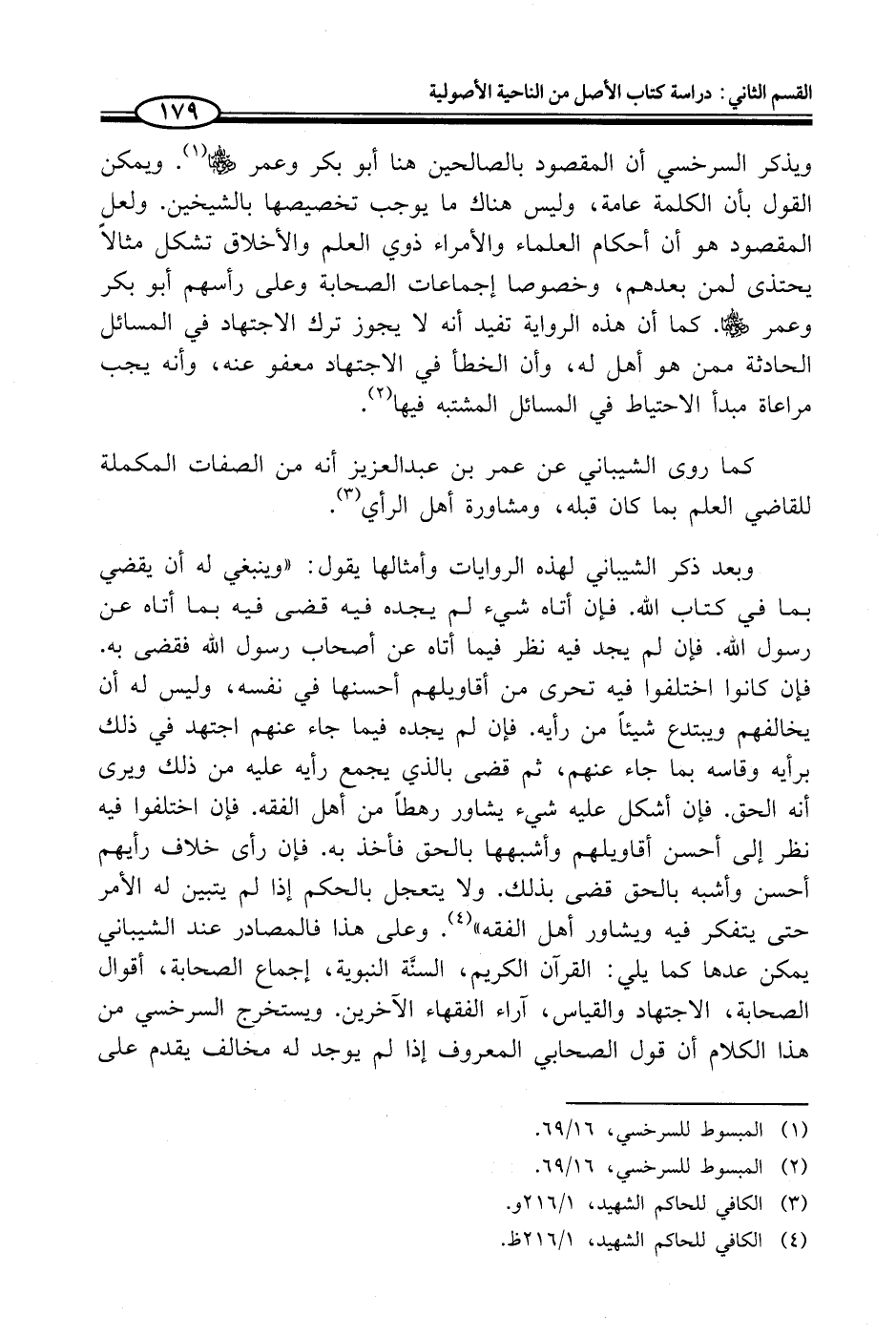 وبعد ذكر الشيباني لهذه الروايات وأمثالها يقول: "وينبغي له أن يقضي بما في كتاب الله. فإن أتاه شيء لم يجده فيه قضى فيه بما أتاه عن رسول الله. فإن لم يجد فيه نظر فيما أتاه عن أصحاب رسول الله فقضى به. فإن كانوا اختلفوا فيه تحرى من أقاويلهم أحسنها في نفسه، وليس له أن يخالفهم ويبتدع شيئاً من رأيه. فإن لم يجده فيما جاء عنهم اجتهد في ذلك برأيه وقاسه بما جاء عنهم، ثم قضى بالذي يجمع رأيه عليه من ذلك ويرى أنه الحق. فإن أشكل عليه شيء يشاور رهطاً من أهل الفقه. فإن اختلفوا فيه نظر إلى أحسن أقاويلهم وأشبهها بالحق فأخذ به. فإن رأى خلاف رأيهم أحسن وأشبه بالحق قضى بذلك. ولا يتعجل بالحكم إذا لم يتبين له الأمر حتى يتفكر فيه ويشاور أهل الفقه" (¬4). وعلى هذا فالمصادر عند الشيباني يمكن عدها كما يلي: القرآن الكريم، السنَّة النبوية، إجماع الصحابة، أقوال الصحابة، الاجتهاد والقياس، آراء الفقهاء الآخرين. ويستخرج السرخسي من هذا الكلام أن قول الصحابي المعروف إذا لم يوجد له مخالف يقدم على