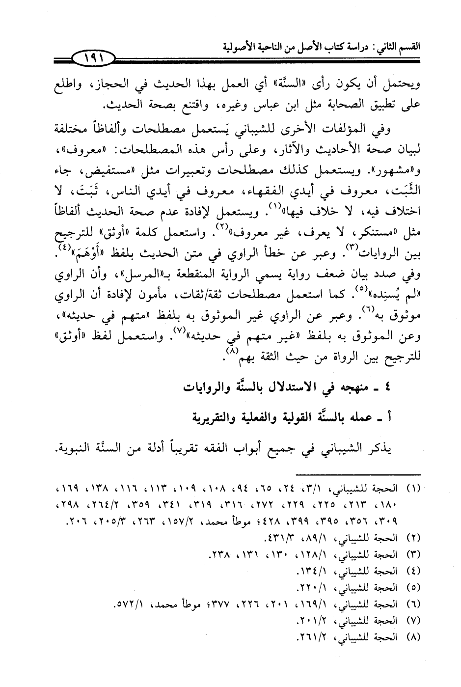 وفي المؤلفات الأخرى للشيباني يَستعمل مصطلحات وألفاظاً مختلفة لبيان صحة الأحاديث والآثار، وعلى رأس هذه المصطلحات: "معروف"، و"مشهور". ويستعمل كذلك مصطلحات وتعبيرات مثل "مستفيض، جاء الثَّبَت، معروف في أيدي الفقهاء، معروف في أيدي الناس، ثَبَتَ، لا اختلاف فيه، لا خلاف فيها" (¬1). ويستعمل لإفادة عدم صحة الحديث ألفاظاً مثل "مستنكر، لا يعرف، غير معروف" (¬2). واستعمل كلمة "أوثق" للترجيح بين الروايات (¬3). وعبر عن خطأ الراوي في متن الحديث بلفظ "أَوْهَمَ" (¬4). وفي صدد بيان ضعف رواية يسمي الرواية المنقطعة بـ "المرسل"، وأن الراوي "لم يُسنِده " (¬5). كما استعمل مصطلحات ثقة / ثقات، مأمون لإفادة أن الراوي موثوق به (¬6). وعبر عن الراوي غير الموثوق به بلفظ "متهم في حديثه"، وعن الموثوق به بلفظ "غير متهم في حديثه" (¬7). واستعمل لفظ "أوثق" للترجيح بين الرواة من حيث الثقة بهم (¬8).