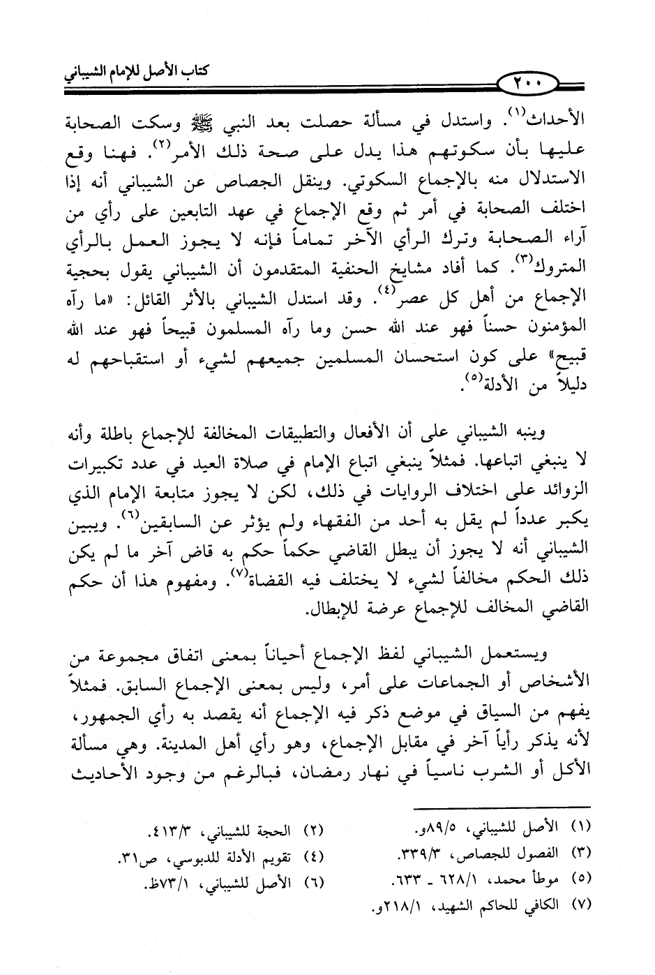 وينبه الشيباني على أن الأفعال والتطبيقات المخالفة للإجماع باطلة وأنه لا ينبغي اتباعها. فمثلاً ينبغي اتباع الإمام في صلاة العيد في عدد تكبيرات الزوائد على اختلاف الروايات في ذلك، لكن لا يجوز متابعة الإمام الذي يكبر عدداً لم يقل به أحد من الفقهاء ولم يؤثر عن السابقين (¬6). ويبين الشيباني أنه لا يجوز أن يبطل القاضي حكماً حكم به قاض آخر ما لم يكن ذلك الحكم مخالفاً لشيء لا يختلف فيه القضاة (¬7). ومفهوم هذا أن حكم القاضي المخالف للإجماع عرضة للإبطال.