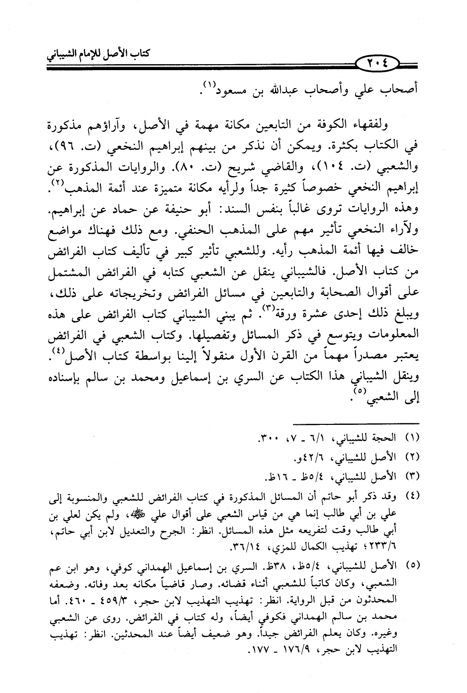 (¬5) الأصل للشيباني، 5/ 4 ظ، 38 ظ. السري بن إسماعيل الهمداني كوفي، وهو ابن عم الشعبي، وكان كاتباً للشعبي أثناء قضائه. وصار قاضياً مكانه بعد وفاته. وضعفه المحدثون من قبل الرواية انظر: تهذيب التهذيب لابن حجر، 3/ 459 - 460. أما محمد بن سالم الهمداني فكوفي أيضاً، وله كتاب في الفرائض. روى عن الشعبي وغيره. وكان يعلم الفرائض جيداً. وهو ضعيف أيضاً عند المحدثين. انظر: تهذيب التهذيب لابن حجر، 9/ 176 - 177.
