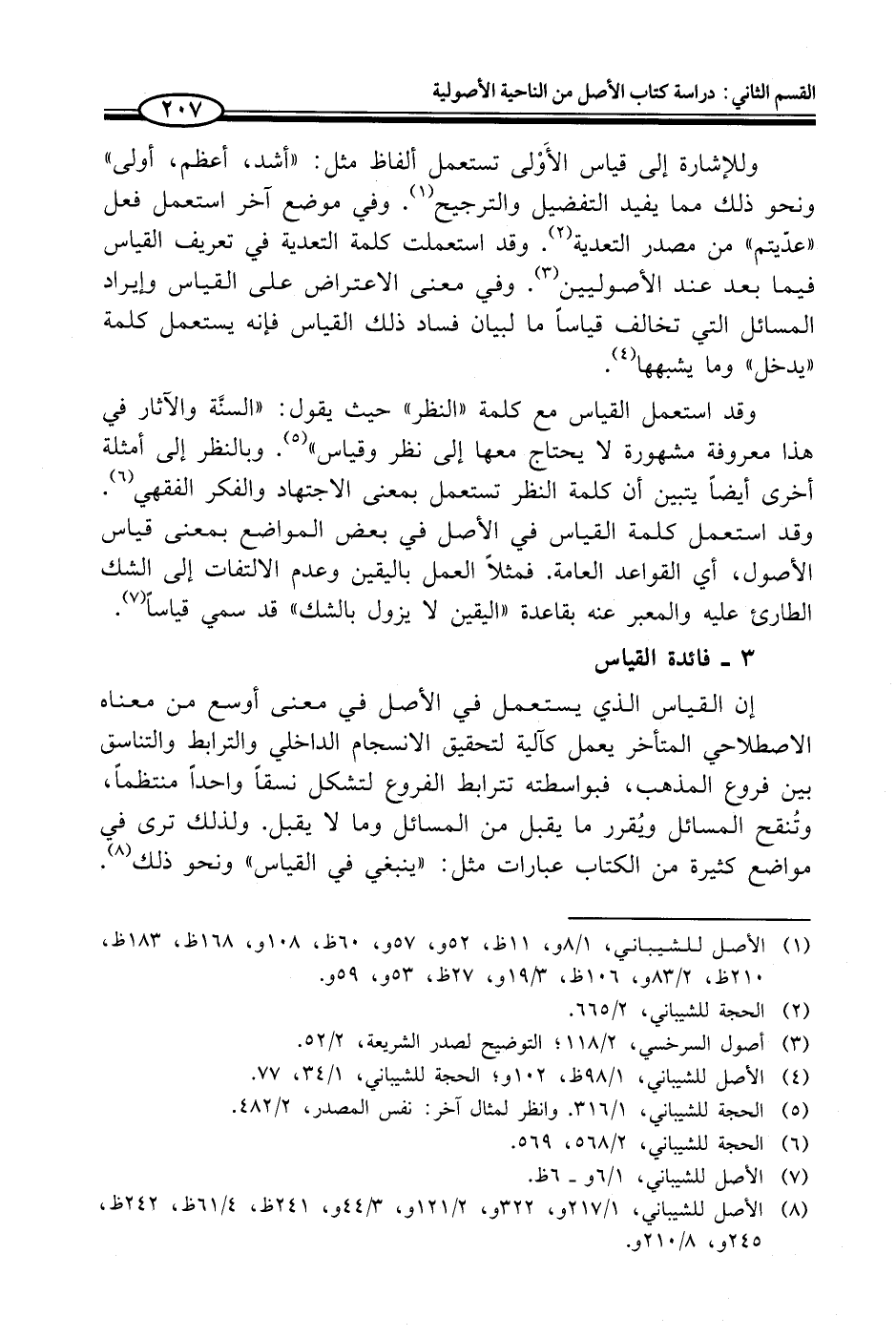 وقد استعمل القياس مع كلمة "النظر" حيث يقول: "السنَّة والآثار في هذا معروفة مشهورة لا يحتاج معها إلى نظر وقياس " (¬5). وبالنظر إلى أمثلة أخرى أيضاً يتبين أن كلمة النظر تستعمل بمعنى الاجتهاد والفكر الفقهي (¬6). وقد استعمل كلمة القياس في الأصل في بعض المواضع بمعنى قياس الأصول، أي القواعد العامة. فمثلاً العمل باليقين وعدم الالتفات إلى الشك الطارئ عليه والمعبر عنه بقاعدة "اليقين لا يزول بالشك" قد سمي قياساً (¬7).