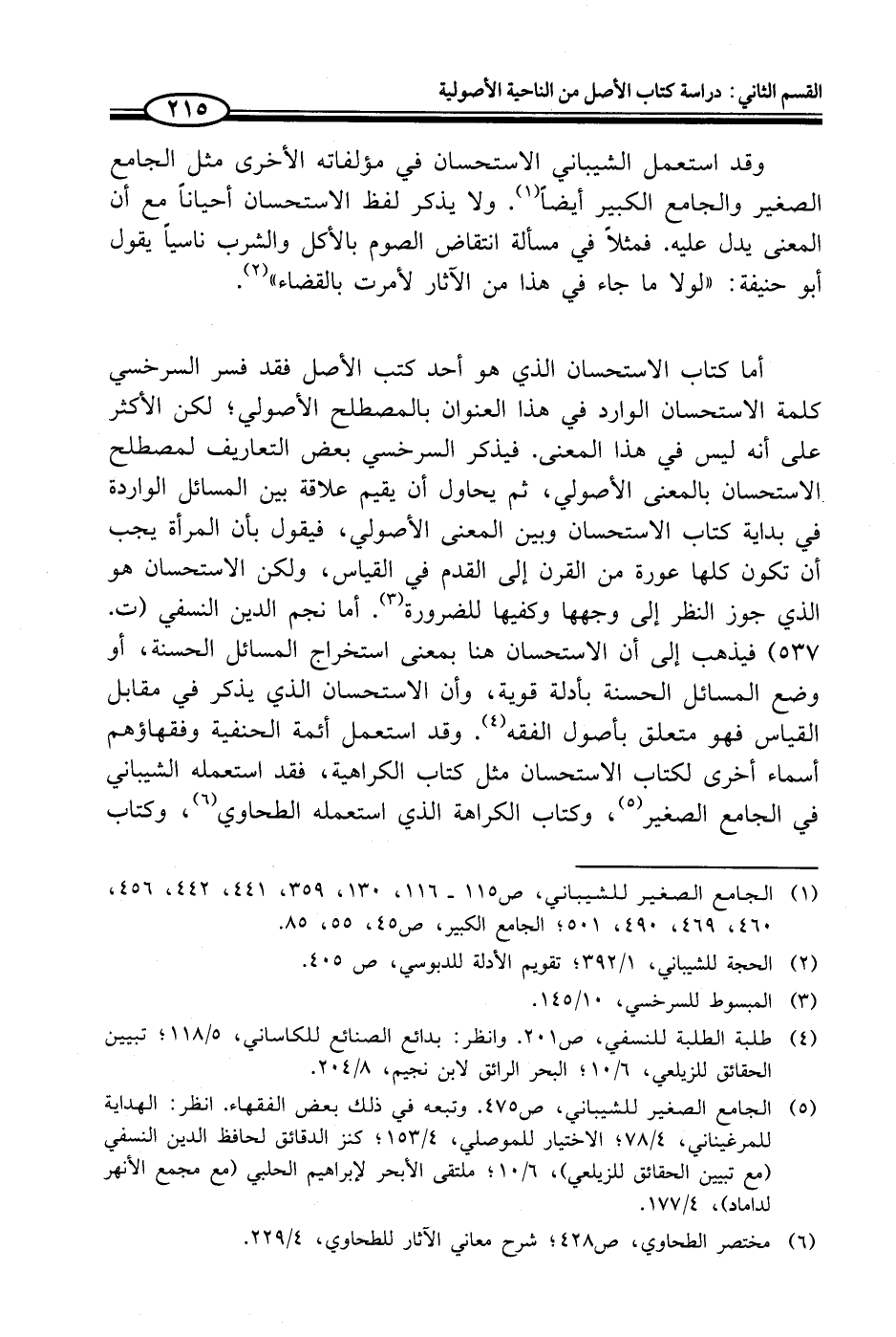 أما كتاب الاستحسان الذي هو أحد كتب الأصل فقد فسر السرخسي كلمة الاستحسان الوارد في هذا العنوان بالمصطلح الأصولي؛ لكن الأكثر على أنه ليس في هذا المعنى. فيذكر السرخسي بعض التعاريف لمصطلح الاستحسان بالمعنى الأصولي، ثم يحاول أن يقيم علاقة بين المسائل الواردة في بداية كتاب الاستحسان وبين المعنى الأصولي، فيقول بأن المرأة يجب أن تكون كلها عورة من القرن إلى القدم في القياس، ولكن الاستحسان هو الذي جوز النظر إلى وجهها وكفيها للضرورة (¬3). أما نجم الدين النسفي (ت. 537) فيذهب إلى أن الاستحسان هنا بمعنى استخراج المسائل الحسنة، أو وضع المسائل الحسنة بأدلة قوية، وأن الاستحسان الذي يذكر في مقابل القياس فهو متعلق بأصول الفقه (¬4). وقد استعمل أئمة الحنفية وفقهاؤهم أسماء أخرى لكتاب الاستحسان مثل كتاب الكراهية، فقد استعمله الشيباني في الجامع الصغير (¬5)، وكتاب الكراهة الذي استعمله الطحاوي (¬6)، وكتاب