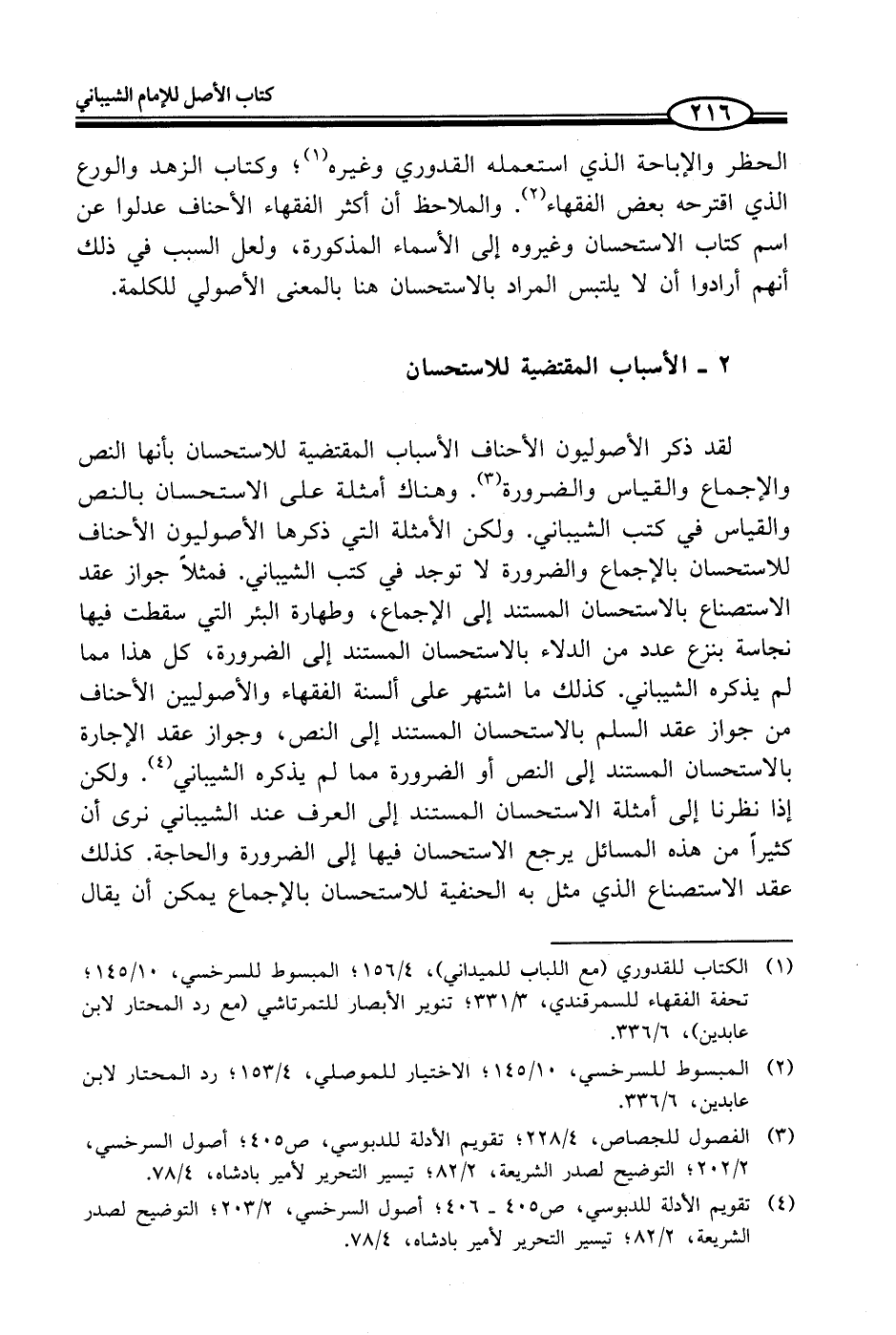 لقد ذكر الأصوليون الأحناف الأسباب المقتضية للاستحسان بأنها النص والإجماع والقياس والضرورة (¬3). وهناك أمثلة على الاستحسان بالنص والقياس في كتب الشيباني. ولكن الأمثلة التي ذكرها الأصوليون الأحناف للاستحسان بالإجماع والضرورة لا توجد في كتب الشيباني. فمثلاً جواز عقد الاستصناع بالاستحسان المستند إلى الإجماع، وطهارة البئر التي سقطت فيها نجاسة بنزع عدد من الدلاء بالاستحسان المستند إلى الضرورة، كل هذا مما لم يذكره الشيباني. كذلك ما اشتهر على ألسنة الفقهاء والأصوليين الأحناف من جواز عقد السلم بالاستحسان المستند إلى النص، وجواز عقد الإجارة بالاستحسان المستند إلى النص أو الضرورة مما لم يذكره الشيباني (¬4). ولكن إذا نظرنا إلى أمثلة الاستحسان المستند إلى العرف عند الشيباني نرى أن كثيراً من هذه المسائل يرجع الاستحسان فيها إلى الضرورة والحاجة. كذلك عقد الاستصناع الذي مثل به الحنفية للاستحسان بالإجماع يمكن أن يقال