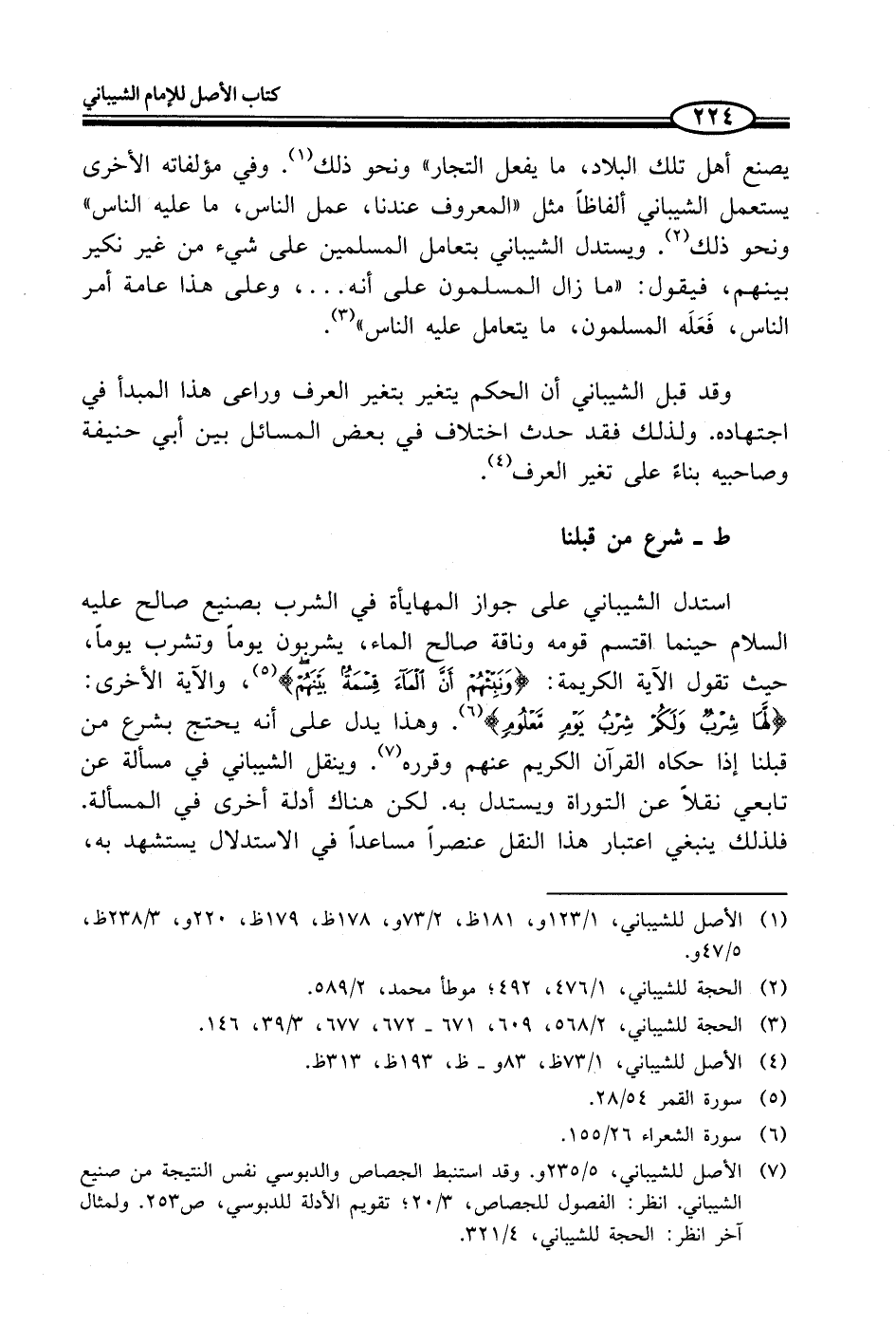 استدل الشيباني على جواز المهايأة في الشرب بصنيع صالح عليه السلام حينما اقتسم قومه وناقة صالح الماء، يشربون يوماً وتشرب يوماً، حيث تقول الآية الكريمة {وَنَبِّئْهُمْ أَنَّ الْمَاءَ قِسْمَةٌ بَيْنَهُمْ} [القمر: 28] (¬5)، والآية الأخرى: {لَهَا شِرْبٌ وَلَكُمْ شِرْبُ يَوْمٍ مَعْلُومٍ} [الشعراء: 155] (¬6). وهذا يدل على أنه يحتج بشرع من قبلنا إذا حكاه القرآن الكريم عنهم وقرره (¬7). وينقل الشيباني في مسألة عن تابعي نقلاً عن التوراة ويستدل به. لكن هناك أدلة أخرى في المسألة. فلذلك ينبغي اعتبار هذا النقل عنصراً مساعداً في الاستدلال يستشهد به،