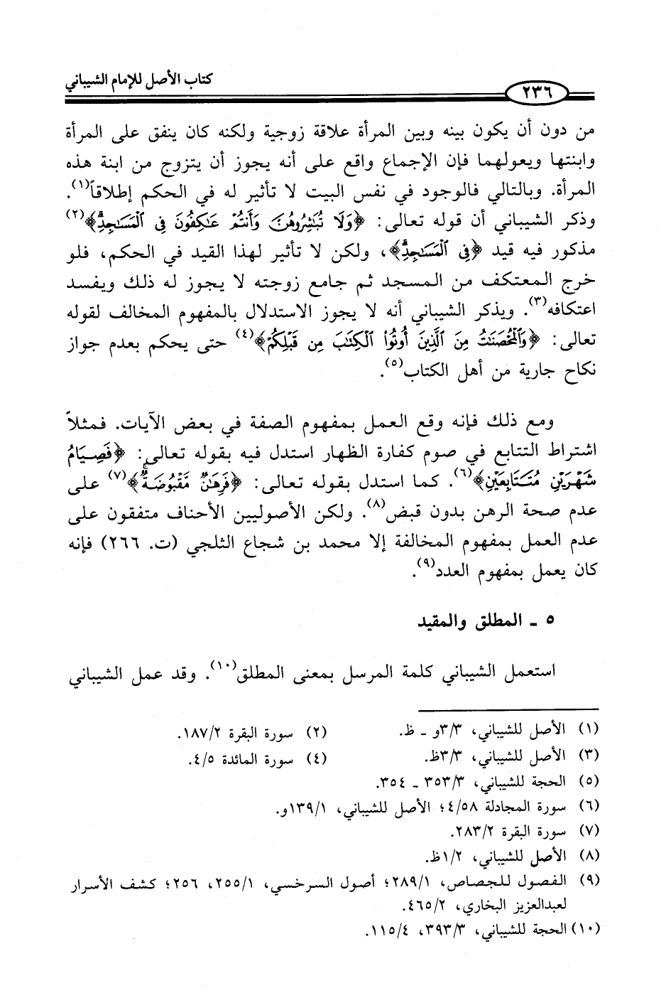 من دون أن يكون بينه وبين المرأة علاقة زوجية ولكنه كان ينفق على المرأة وابنتها ويعولهما فإن الإجماع واقع على أنه يجوز أن يتزوج من ابنة هذه المرأة. وبالتالي فالوجود في نفس البيت لا تأثير له في الحكم إطلاقاً (¬1). وذكر الشيباني أن قوله تعالى: {وَلَا تُبَاشِرُوهُنَّ وَأَنْتُمْ عَاكِفُونَ فِي الْمَسَاجِدِ} (¬2) مذكور فيه قيد {فِي الْمَسَاجِدِ}، ولكن لا تأثير لهذا القيد في الحكم، فلو خرج المعتكف من المسجد ثم جامع زوجته لا يجوز له ذلك ويفسد اعتكافه (¬3). ويذكر الشيباني أنه لا يجوز الاستدلال بالمفهوم المخالف لقوله تعالى: {وَالْمُحْصَنَاتُ مِنَ الَّذِينَ أُوتُوا الْكِتَابَ مِنْ قَبْلِكُمْ} (¬4) حتى يحكم بعدم جواز نكاح جارية من أهل الكتاب (¬5).