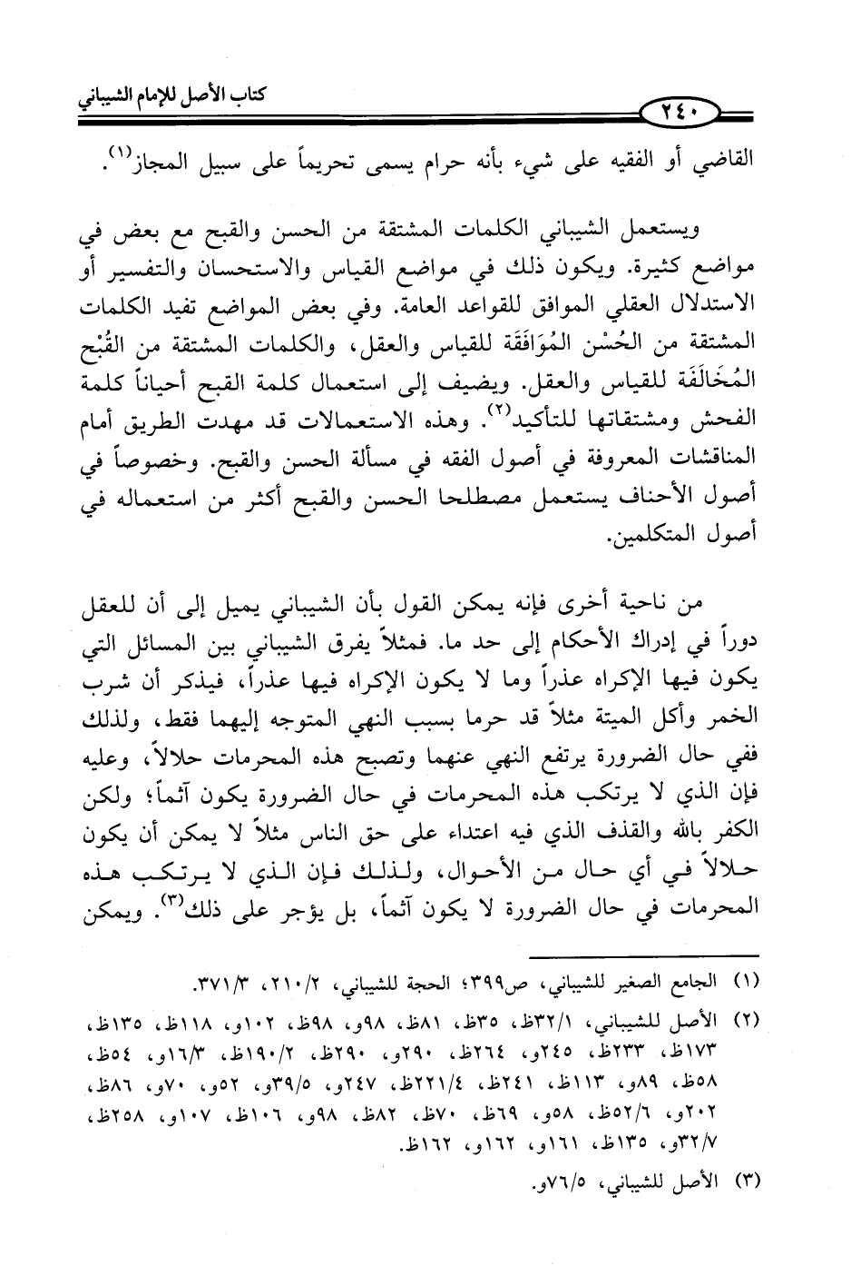 ويستعمل الشيباني الكلمات المشتقة من الحسن والقبح مع بعض في مواضع كثيرة. ويكون ذلك في مواضع القياس والاستحسان والتفسير أو الاستدلال العقلي الموافق للقواعد العامة. وفي بعض المواضع تفيد الكلمات المشتقة من الحُسْن المُوَافَقَة للقياس والعقل، والكلمات المشتقة من القُبْح المُخَالَفَة للقياس والعقل. ويضيف إلى استعمال كلمة القبح أحياناً كلمة الفحش ومشتقاتها للتأكيد (¬2). وهذه الاستعمالات قد مهدت الطريق أمام المناقشات المعروفة في أصول الفقه في مسألة الحسن والقبح. وخصوصًا في أصول الأحناف يستعمل مصطلحا الحسن والقبح أكثر من استعماله في أصول المتكلمين.