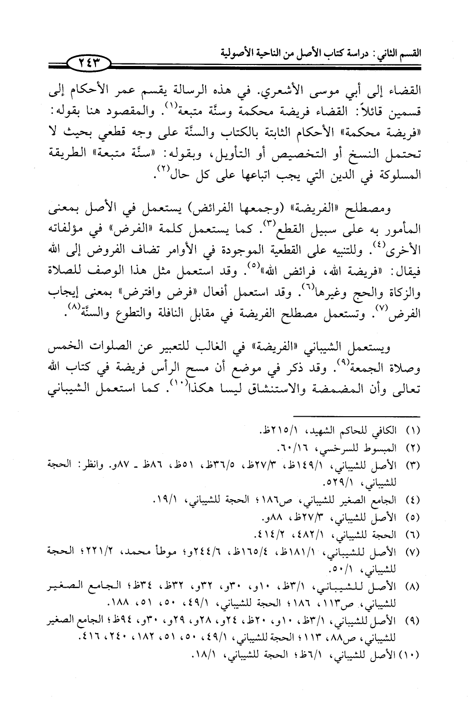 ويستعمل الشيباني "الفريضة" في الغالب للتعبير عن الصلوات الخمس وصلاة الجمعة (¬9). وقد ذكر في موضع أن مسح الرأس فريضة في كتاب الله تعالى وأن المضمضة والاستنشاق ليسا هكذا (¬10). كما استعمل الشيباني