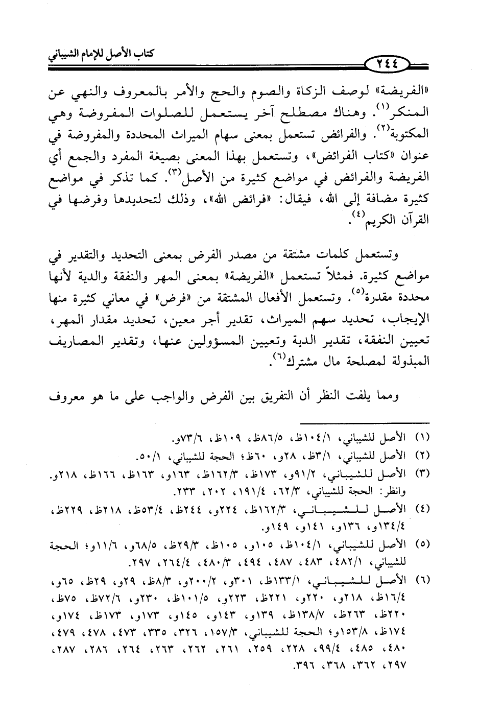 "الفريضة" لوصف الزكاة والصوم والحج والأمر بالمعروف والنهي عن المنكر (¬1). وهناك مصطلح آخر يستعمل للصلوات المفروضة وهي المكتوبة (¬2). والفرائض تستعمل بمعنى سهام الميراث المحددة والمفروضة في عنوان "كتاب الفرائض "، وتستعمل بهذا المعنى بصيغة المفرد والجمع أي الفريضة والفرائض في مواضع كثيرة من الأصل (¬3). كما تذكر في مواضع كثيرة مضافة إلى الله، فيقال: "فرائض الله"، وذلك لتحديدها وفرضها في القرآن الكريم (¬4).