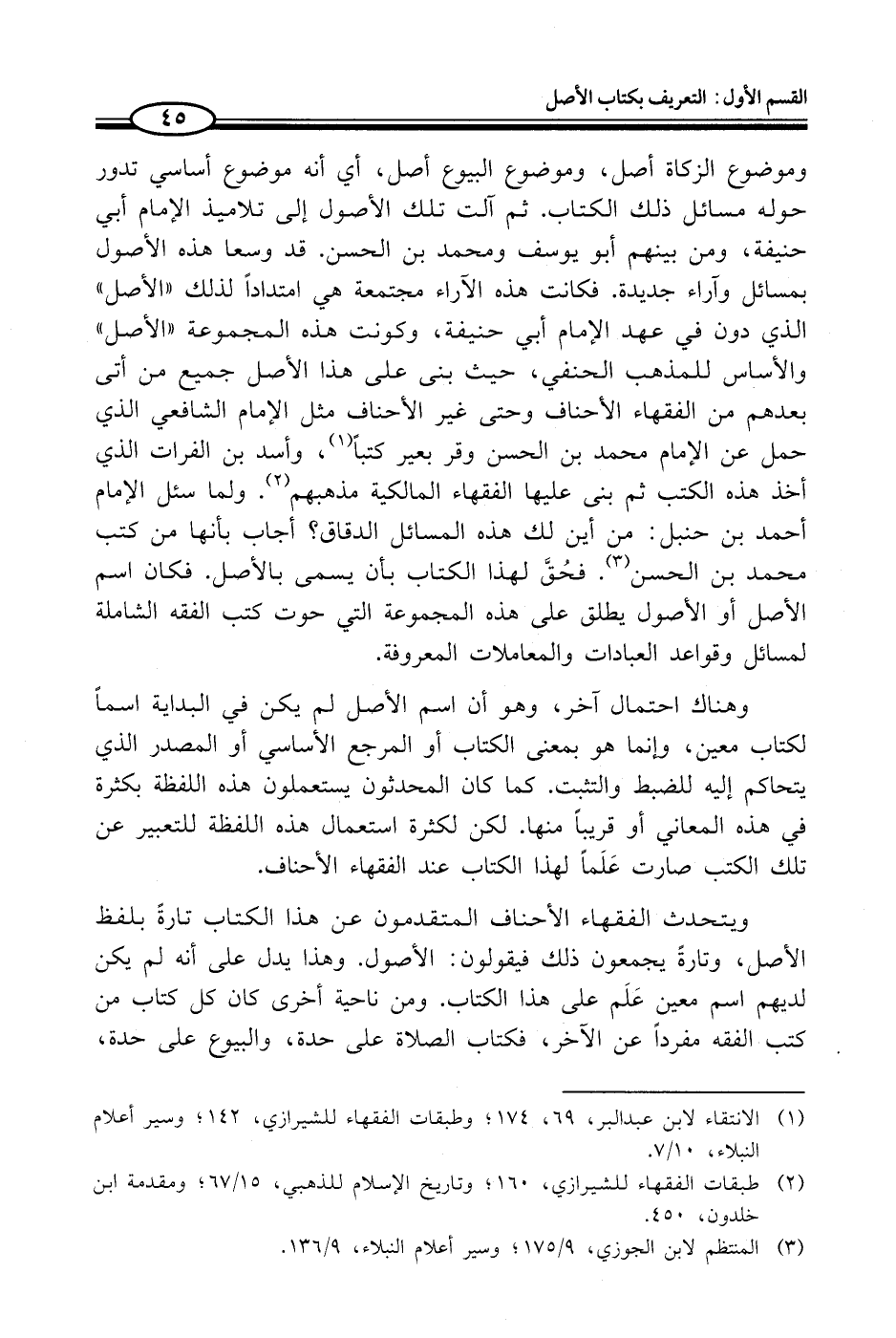 وموضوع الزكاة أصل، وموضوع البيوع أصل، أي أنه موضوع أساسي تدور حوله مسائل ذلك الكتاب. ثم آلت تلك الأصول إلى تلاميذ الإمام أبي حنيفة، ومن بينهم أبو يوسف ومحمد بن الحسن. قد وسعا هذه الأصول بمسائل وآراء جديدة. فكانت هذه الآراء مجتمعة هي امتداداً لذلك "الأصل" الذي دون في عهد الإمام أبي حنيفة، وكونت هذه المجموعة "الأصل" والأساس للمذهب الحنفي، حيث بنى على هذا الأصل جميع من أتى بعدهم من الفقهاء الأحناف وحتى غير الأحناف مثل الإمام الشافعي الذي حمل عن الإمام محمد بن الحسن وقر بعير كتباً (¬1)، وأسد بن الفرات الذي أخذ هذه الكتب ثم بنى عليها الفقهاء المالكية مذهبهم (¬2). ولما سئل الإمام أحمد بن حنبل: من أين لك هذه المسائل الدقاق؟ أجاب بأنها من كتب محمد بن الحسن (¬3). فحُقَّ لهذا الكتاب بأن يسمى بالأصل. فكان اسم الأصل أو الأصول يطلق على هذه المجموعة التي حوت كتب الفقه الشاملة لمسائل وقواعد العبادات والمعاملات المعروفة.