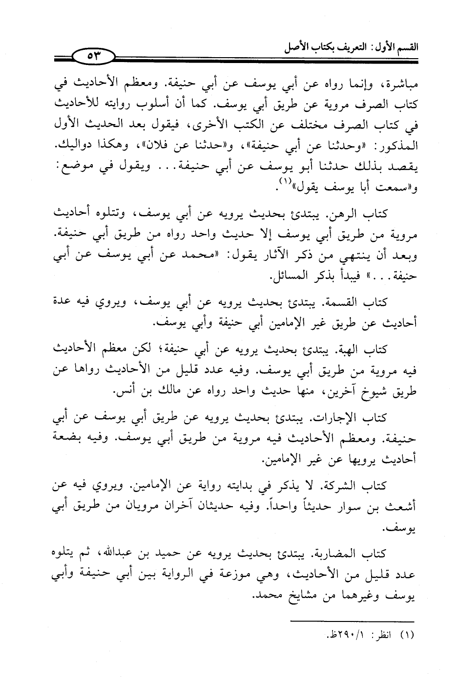 مباشرة، وإنما رواه عن أبي يوسف عن أبي حنيفة. ومعظم الأحاديث في كتاب الصرف مروية عن طريق أبي يوسف. كما أن أسلوب روايته للأحاديث في كتاب الصرف مختلف عن الكتب الأخرى، فيقول بعد الحديث الأول المذكور: "وحدثنا عن أبي حنيفة"، و"حدثنا عن فلان"، وهكذا دواليك. يقصد بذلك حدثنا أبو يوسف عن أبي حنيفة ... ويقول في موضع: و"سمعت أبا يوسف يقول" (¬1).