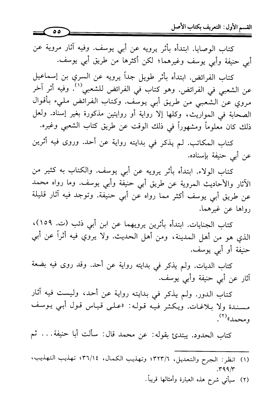 كتاب الفرائض. ابتدأه بأثر طويل جداً يرويه عن السري بن إسماعيل عن الشعبي في الفرائض. وهو كتاب في الفرائض للشعبي (¬1). وفيه أثر آخر مروي عن الشعبي من طريق أبي يوسف. وكتاب الفرائض مليء بأقوال الصحابة في المواريث، وكلها إلا رواية أو روايتين مذكورة بغير إسناد. ولعل ذلك كان معلوماً ومشهوراً في ذلك الوقت عن طريق كتاب الشعبي وغيره.
