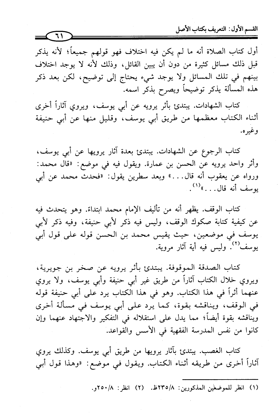 كتاب الوقف. يظهر أنه من تأليف الإمام محمد ابتداءً. وهو يتحدث فيه عن كيفية كتابة صكوك الوقف، وليس فيه ذكر لأبي حنيفة، وفيه ذكر لأبي يوسف في موضعين، حيث يقيس محمد بن الحسن قوله على قول أبي يوسف (¬2). وليس فيه أية آثار مروية.