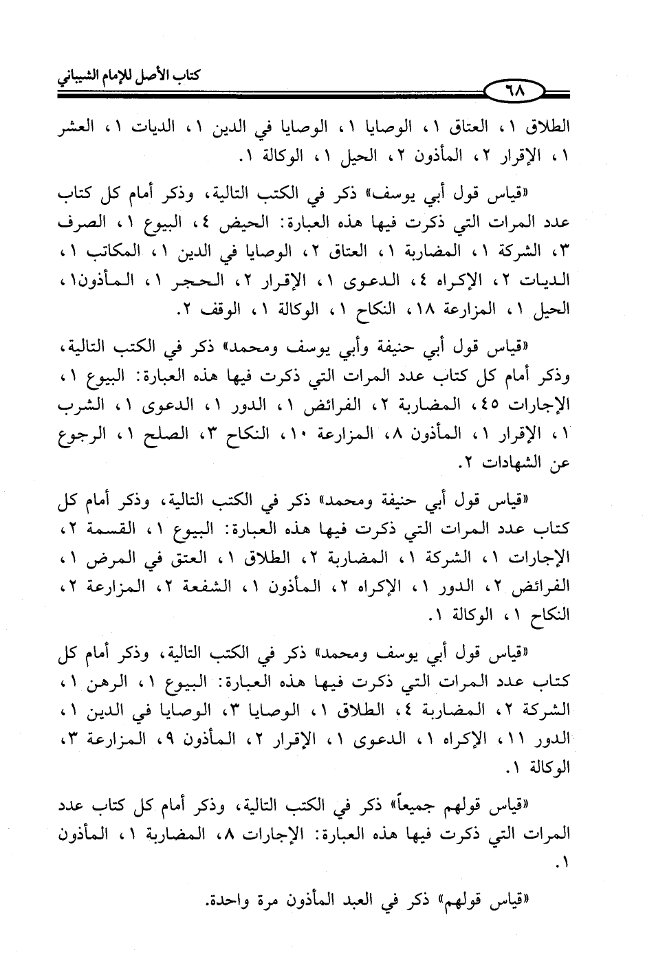 "قياس قول أبي حنيفة وأبي يوسف ومحمد" ذكر في الكتب التالية، وذكر أمام كل كتاب عدد المرات التي ذكرت فيها هذه العبارة: البيوع 1، الإجارات 45، المضاربة 2، الفرائض 1، الدور 1، الدعوى 1، الشرب 1، الإقرار 1، المأذون 8، المزارعة 15، النكاح 3، الصلح 1، الرجوع عن الشهادات 2.