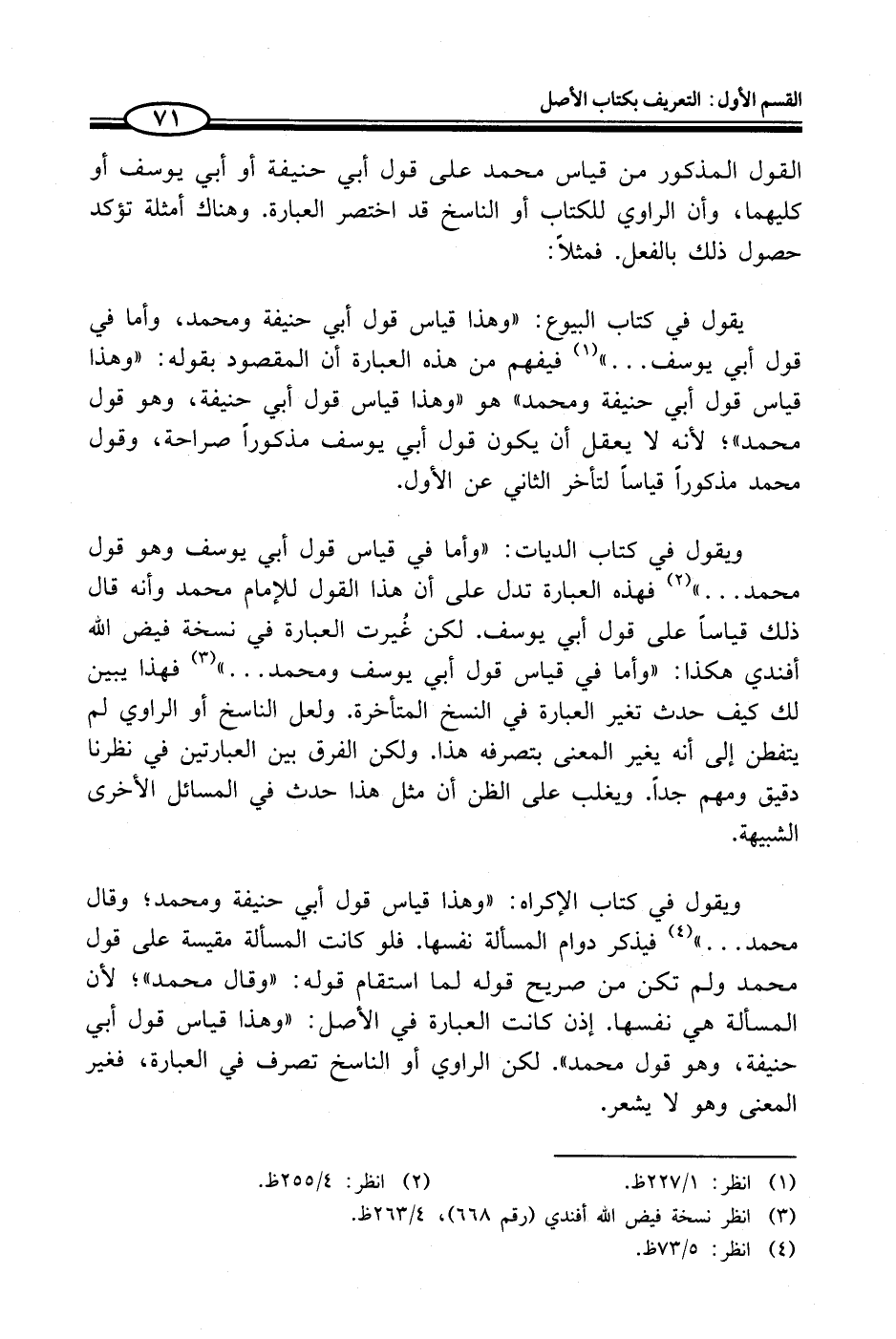 ويقول في كتاب الديات: "وأما في قياس قول أبي يوسف وهو قول محمد ... " (¬2) فهذه العبارة تدل على أن هذا القول للإمام محمد وأنه قال ذلك قياساً على قول أبي يوسف. لكن غُيرت العبارة في نسخة فيض الله أفندي هكذا: "وأما في قياس قول أبي يوسف ومحمد ... " (¬3) فهذا يبين لك كيف حدث تغير العبارة في النسخ المتأخرة. ولعل الناسخ أو الراوي لم يتفطن إلى أنه يغير المعني بتصرفه هذا. ولكن الفرق بين العبارتين في نظرنا دقيق ومهم جداً. ويغلب على الظن أن مثل هذا حدث في المسائل الأخرى الشبيهة.