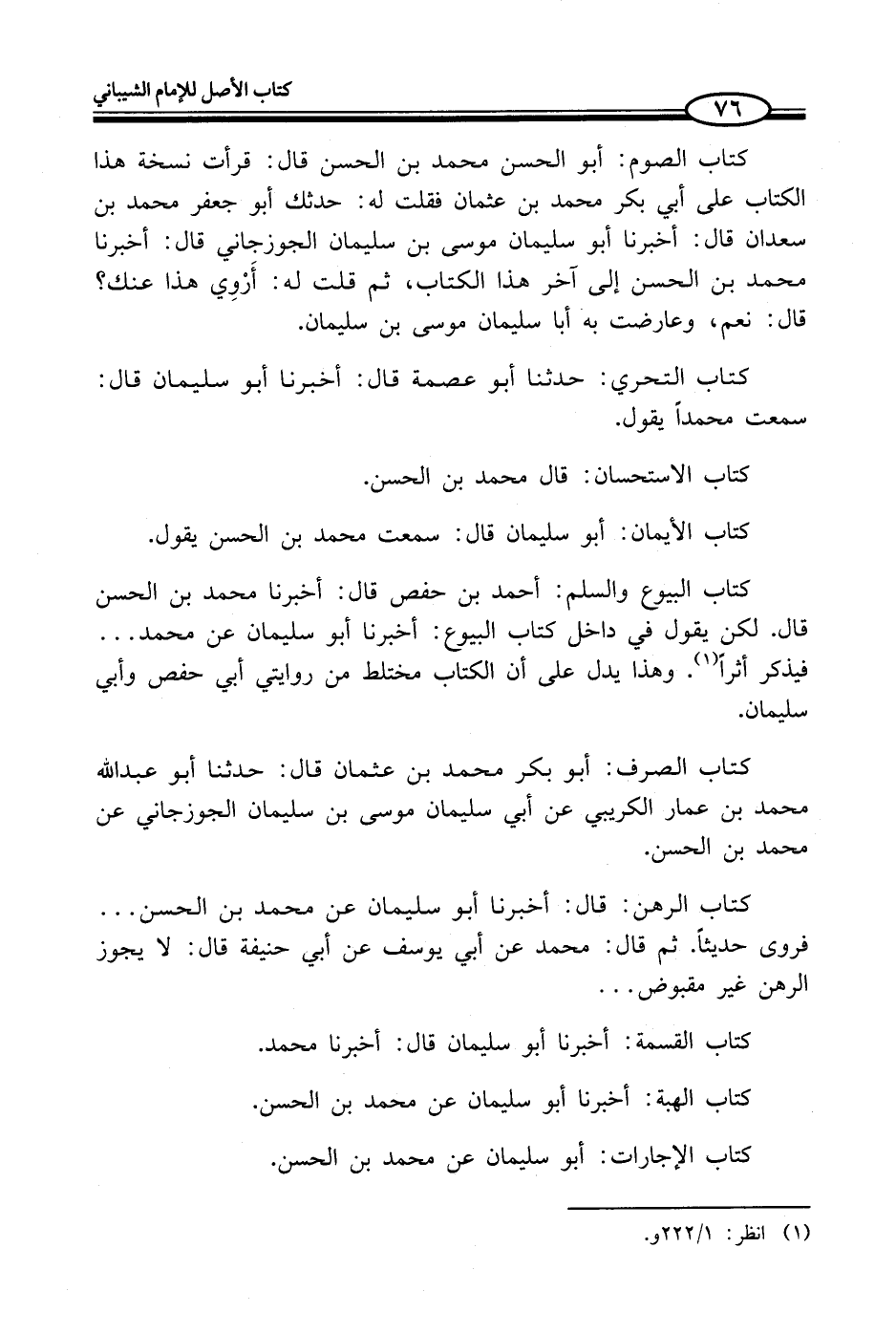 كتاب الصوم: أبو الحسن محمد بن الحسن قال: قرأت نسخة هذا الكتاب على أبي بكر محمد بن عثمان فقلت له: حدثك أبو جعفر محمد بن سعدان قال: أخبرنا أبو سليمان موسي بن سليمان الجوزجاني قال: أخبرنا محمد بن الحسن إلى آخر هذا الكتاب، ثم قلت له: أَرْوِي هذا عنك؟ قال: نعم، وعارضت به أبا سليمان موسي بن سليمان.