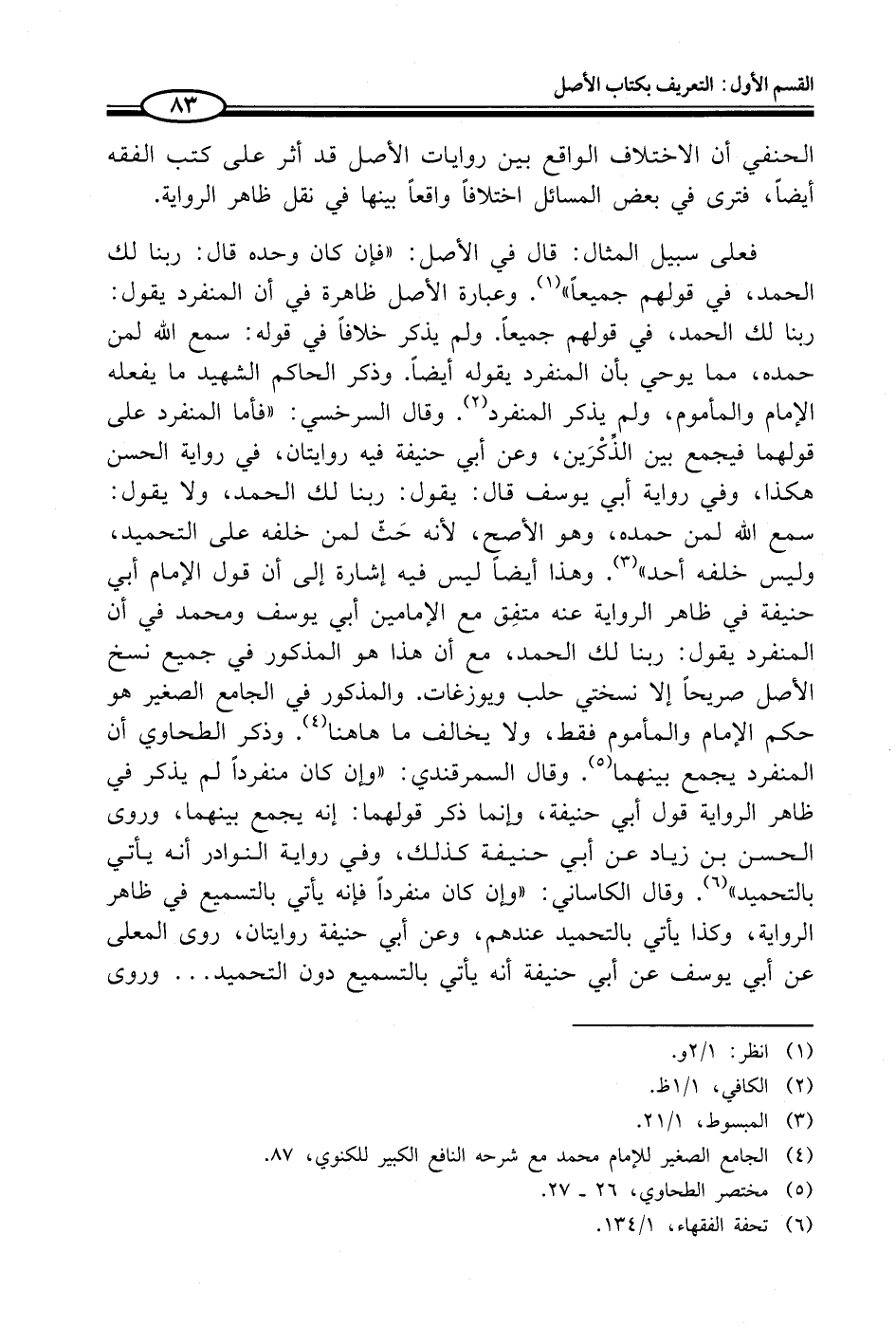 فعلى سبيل المثال: قال في الأصل: "فإن كان وحده قال: ربنا لك الحمد، في قولهم جميعاً" (¬1). وعبارة الأصل ظاهرة في أن المنفرد يقول: ربنا لك الحمد، في قولهم جميعاً. ولم يذكر خلافًا في قوله: سمع الله لمن حمده، مما يوحي بأن المنفرد يقوله أيضاً. وذكر الحاكم الشهيد ما يفعله الإمام والمأموم، ولم يذكر المنفرد (¬2). وقال السرخسي: "فأما المنفرد على قولهما فيجمع بين الذِّكْرَين، وعن أبي حنيفة فيه روايتان، في رواية الحسن هكذا، وفي رواية أبي يوسف قال: يقول: ربنا لك الحمد، ولا يقول: سمع الله لمن حمده، وهو الأصح، لأنه حَثّ لمن خلفه على التحميد، وليس خلفه أحد" (¬3). وهذا أيضاً ليس فيه إشارة إلى أن قول الإمام أبي حنيفة في ظاهر الرواية عنه متفِق مع الإمامين أبي يوسف ومحمد في أن المنفرد يقول: ربنا لك الحمد، مع أن هذا هو المذكور في جميع نسخ الأصل صريحًا إلا نسختي حلب ويوزغات. والمذكور في الجامع الصغير هو حكم الإمام والمأموم فقط، ولا يخالف ما هاهنا (¬4). وذكر الطحاوي أن المنفرد يجمع بينهما (¬5). وقال السمرقندي: "وإن كان منفرداً لم يذكر في ظاهر الرواية قول أبي حنيفة، وإنما ذكر قولهما: إنه يجمع بينهما، وروى الحسن بن زياد عن أبي حنيفة كذلك، وفي رواية النوادر أنه يأتي بالتحميد" (¬6). وقال الكاساني: "وإن كان منفرداً فإنه يأتي بالتسميع في ظاهر الرواية، وكذا يأتي بالتحميد عندهم، وعن أبي حنيفة روايتان، روى المعلى عن أبي يوسف عن أبي حنيفة أنه يأتي بالتسميع دون التحميد ... وروى
