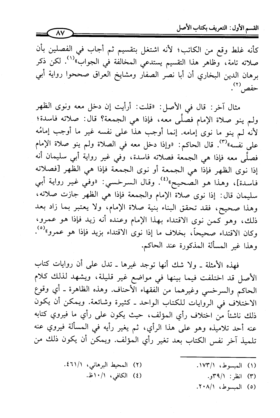 فهذه الأمثلة- ولا شك أنها توجد غيرها- تدل على أن روايات كتاب الأصل قد اختلفت فيما بينها في مواضع غير قليلة، ويشهد لذلك كلام الحاكم والسرخسي وغيرهما من الفقهاء الأحناف. وهذه الظاهرة - أي وقوع الاختلاف في الروايات للكتاب الواحد - كثيرة وشائعة. ويمكن أن يكون ذلك ناشئاً من اختلاف رأي المؤلف، حيث يكون على رأي ما فيروي كتابه عنه أحد تلاميذه وهو على هذا الرأي، ثم يغير رأيه في المسألة فيروي عنه تلميذ آخر نفس الكتاب بعد تغير رأي المؤلف. ويمكن أن يكون ذلك من